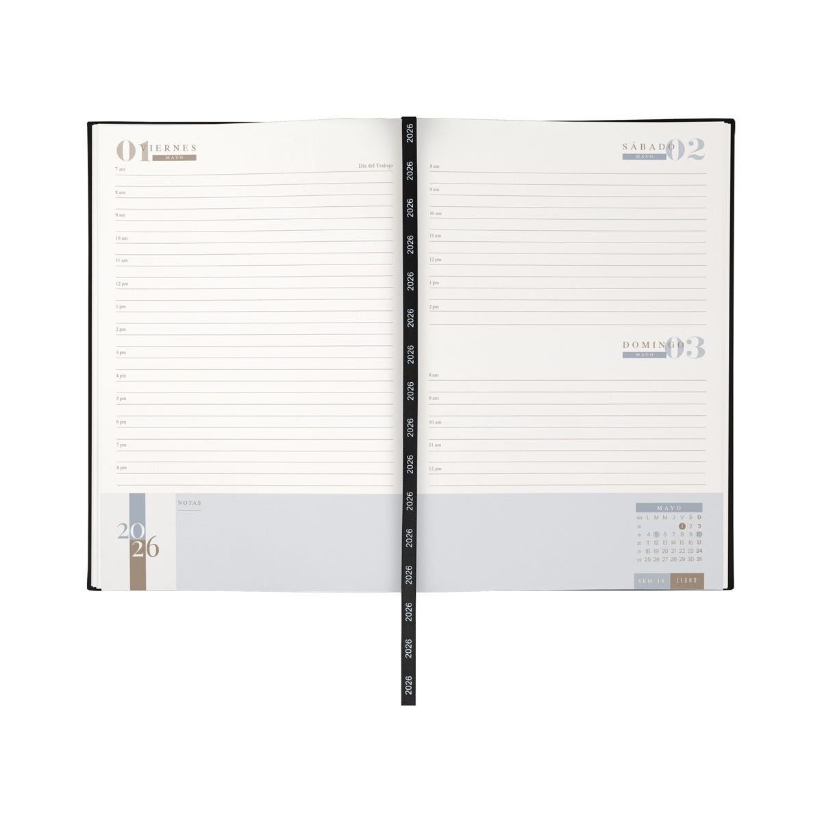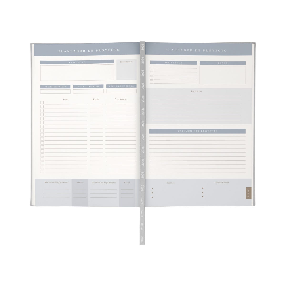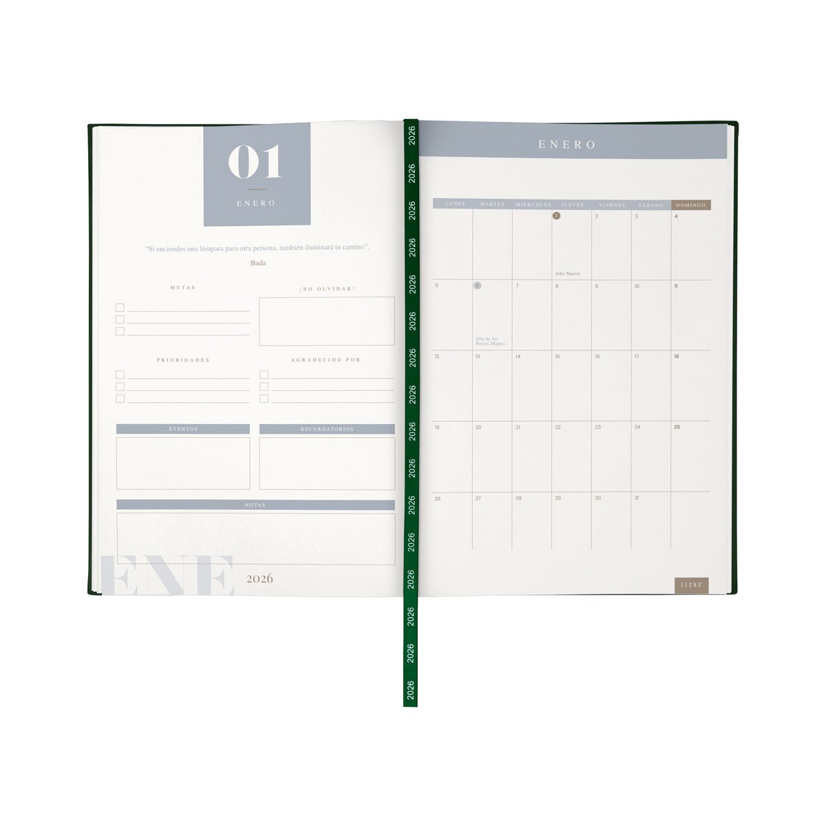 Descripción: Agenda diaria con 186 hojas. Contiene datos personales, calendarios 2025-2026-2027, planeador 2026, presupuesto de gastos, seguimiento de nuevos hábitos, organizador de tareas, planeador de proyectos y días festivos. Incluye caja individual.