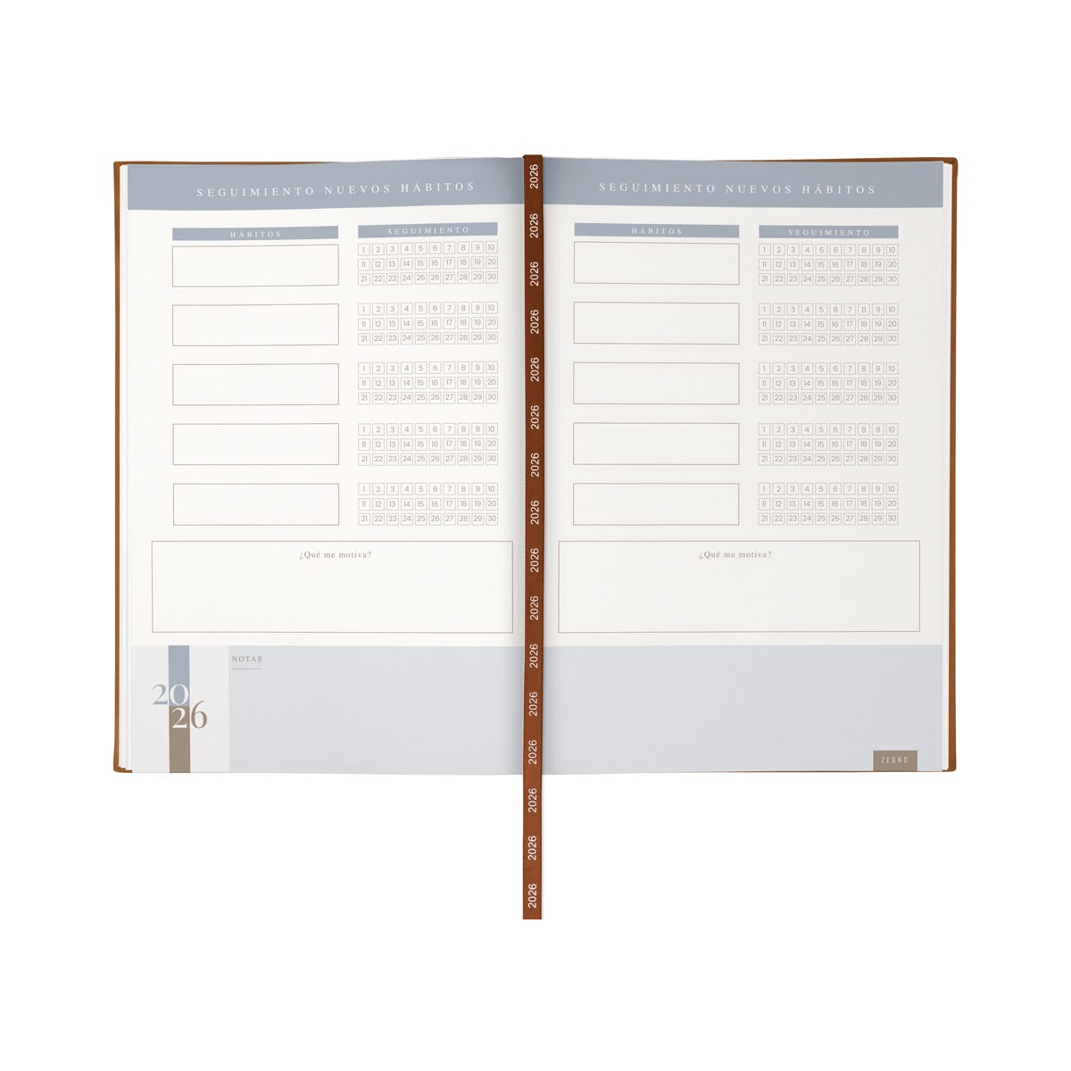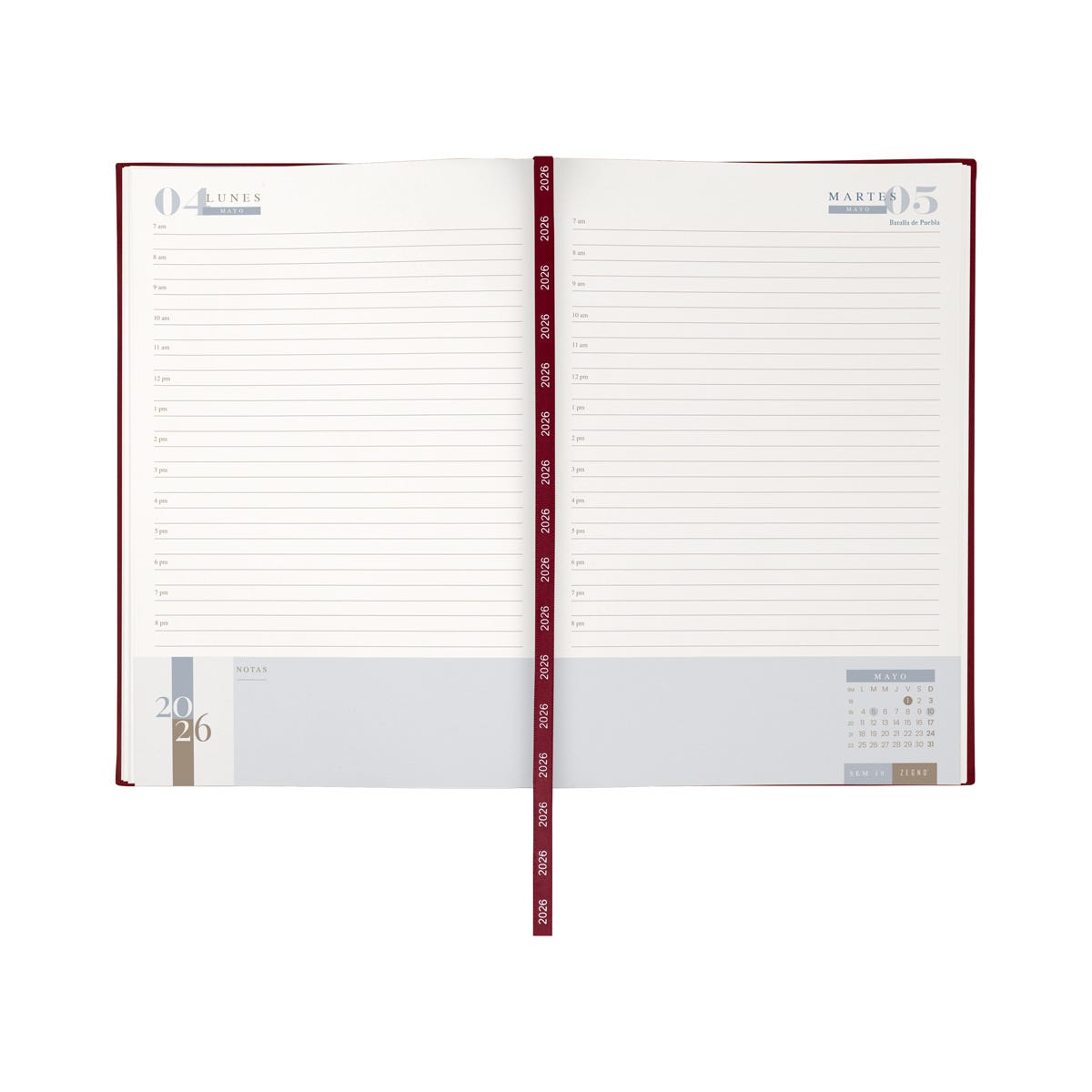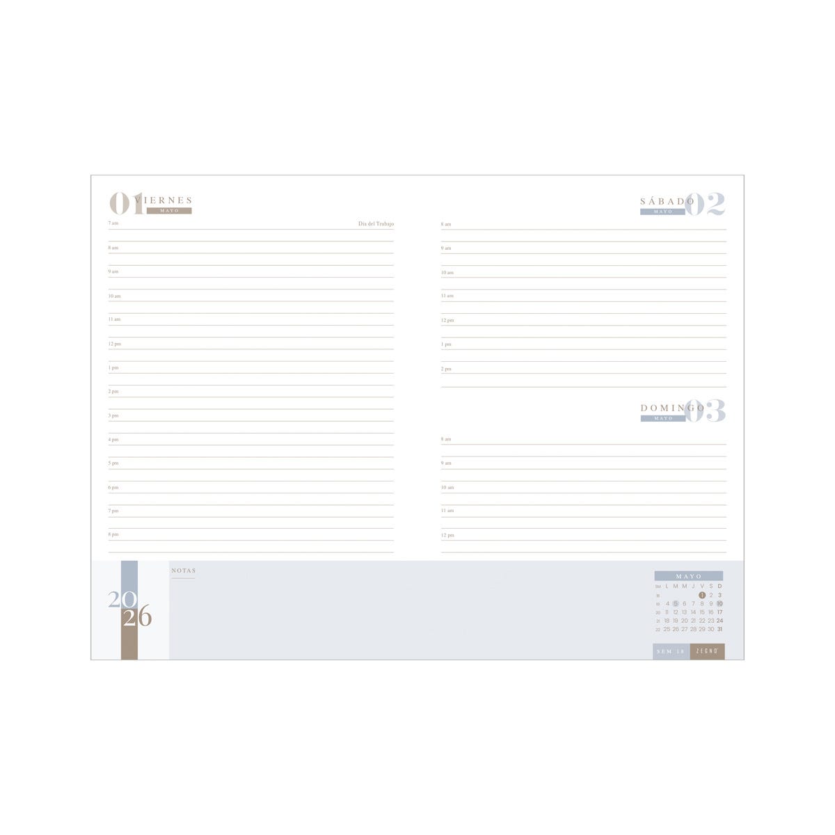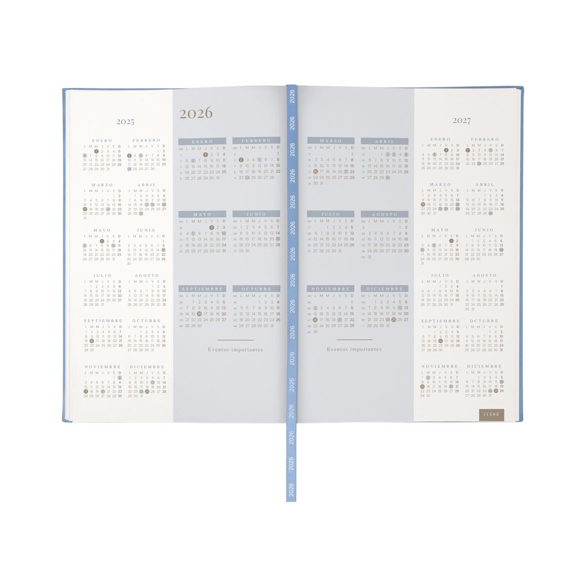 Descripción: Agenda diaria con 186 hojas. Contiene datos personales, calendarios 2025-2026-2027, planeador 2026, presupuesto de gastos, seguimiento de nuevos hábitos, organizador de tareas, planeador de proyectos y días festivos. Incluye caja individual.