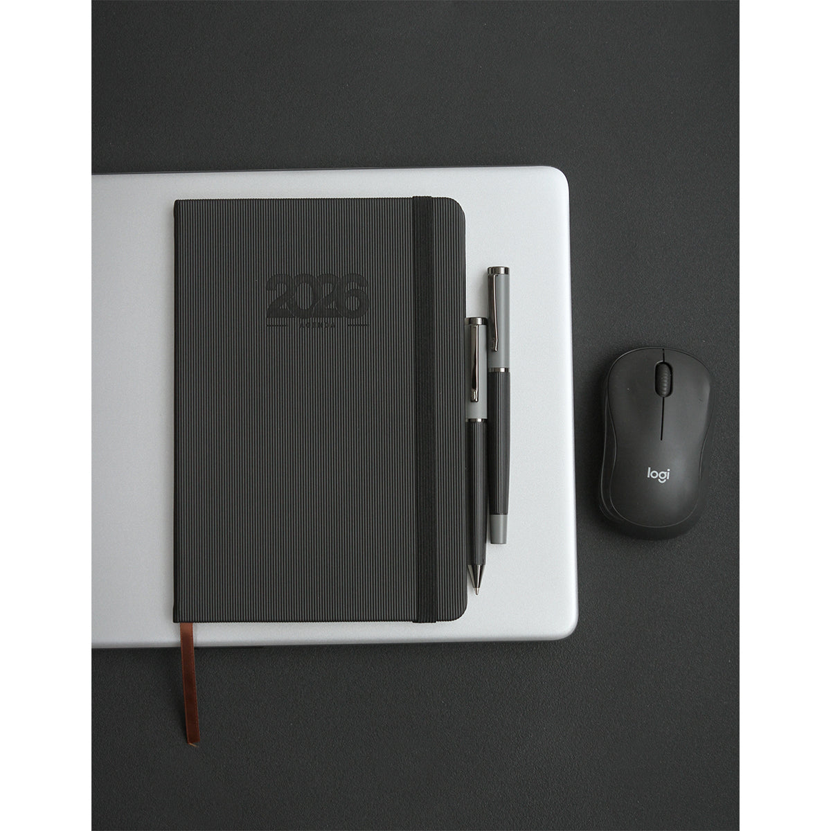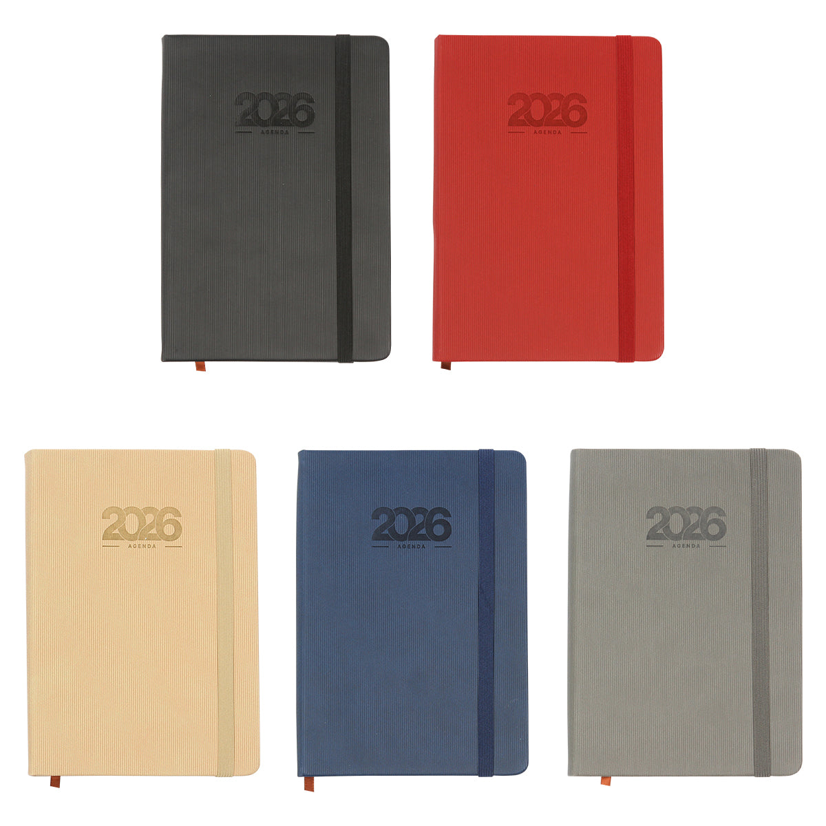 Descripción: Set de Agenda diaria 2026 con pluma y caja de regalo. Cubierta fabricada en curpiel (PU) con resorte sujetador e interior de 175 hojas de 65 g. (350 paginas) Cada día tiene espacio para tareas importantes y está organizada por horario (5:00 am - 22:00 pm). Cuenta con: Separador de hojas, Calendario anual 2025-2027, planeador mensual, hoja de objetivos anuales, hoja de pendientes mensuales, espacio para notas, tareas, sección de contactos y bolsillo interno para almacenar documentos. Incluye caja de cartón individual y bolígrafo con tinta de escritura negra.