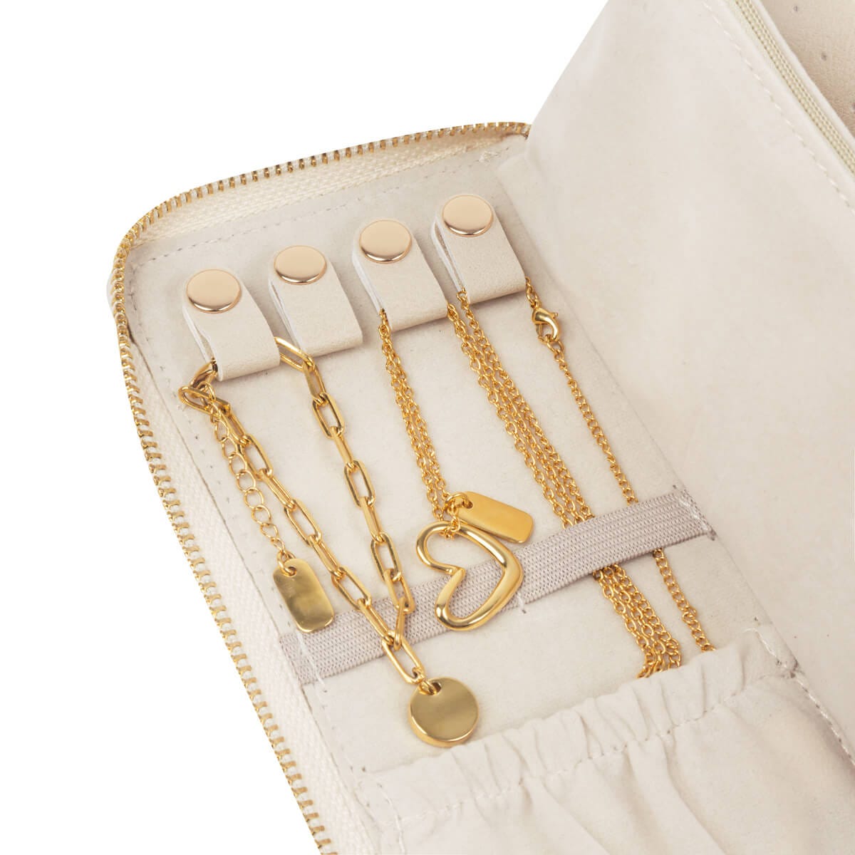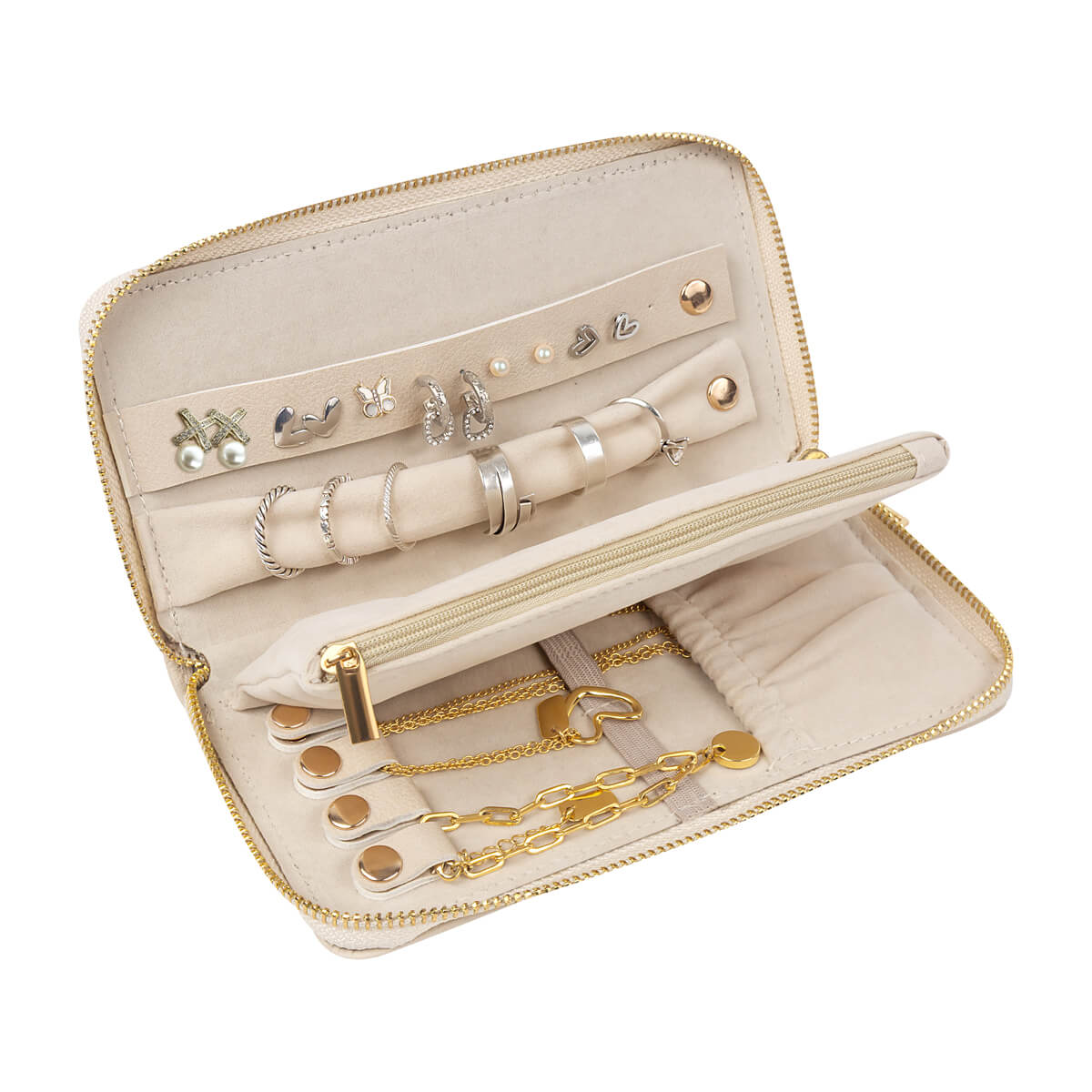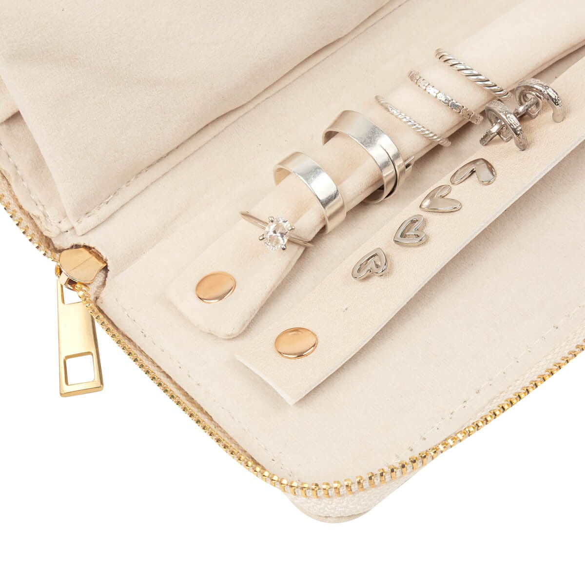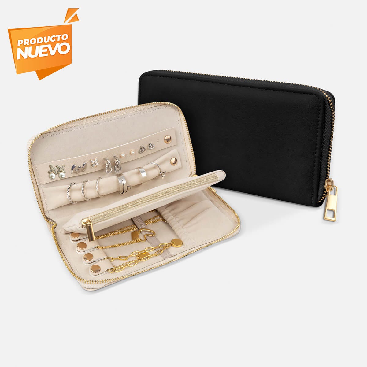 Descripción: Organizador de joyería para viaje con diseño tipo cartera. Cuenta con múltiples compartimentos internos para organizar anillos, aretes, collares y pulseras, incluyendo ganchos metálicos, bolsillo con cierre y bandas con broches. Cierre completo y formato compacto para llevarlo en bolsa o maleta sin ocupar mucho espacio.
