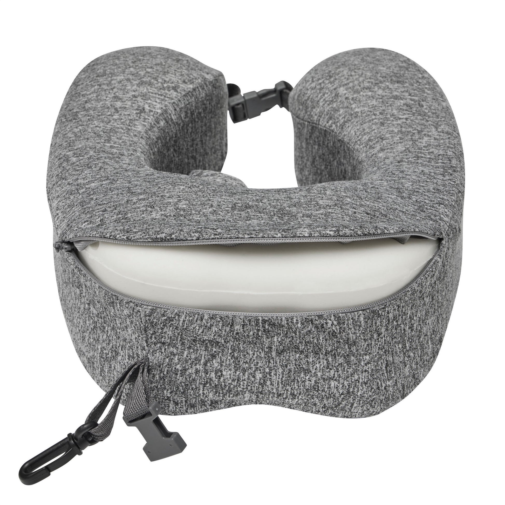 Descripción: Almohada cervical. Funda extraíble con cierre metálico y capucha incluida. Correas con cierre a presión y mosquetón de plástico para optimizar el almacenamiento y el transporte