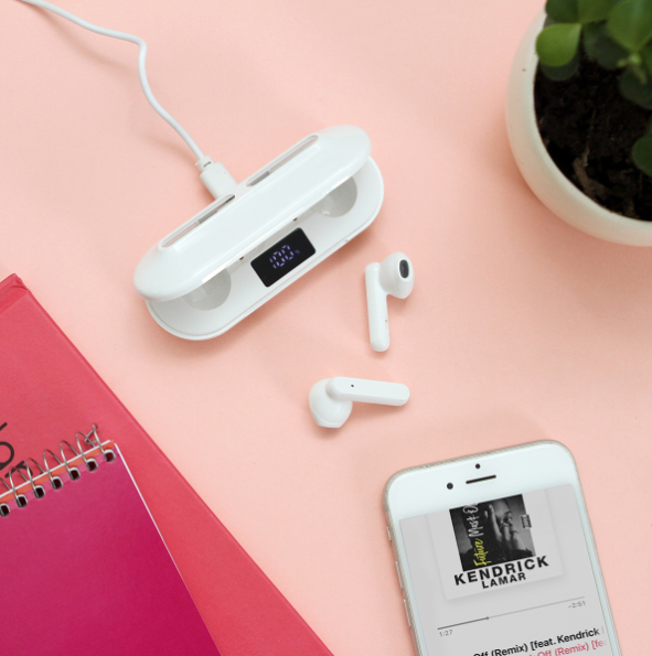 Descripción: Audífonos bluetooth con función touch, estuche de carga fabricado en plástico ABS, tiempo de reproducción de música de 3 a 4 horas. Carga a través de cable USB (incluido). Incluye caja de cartón individual.