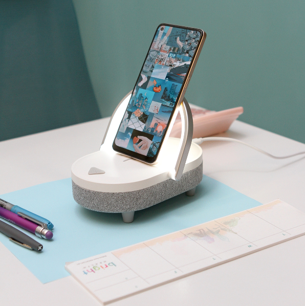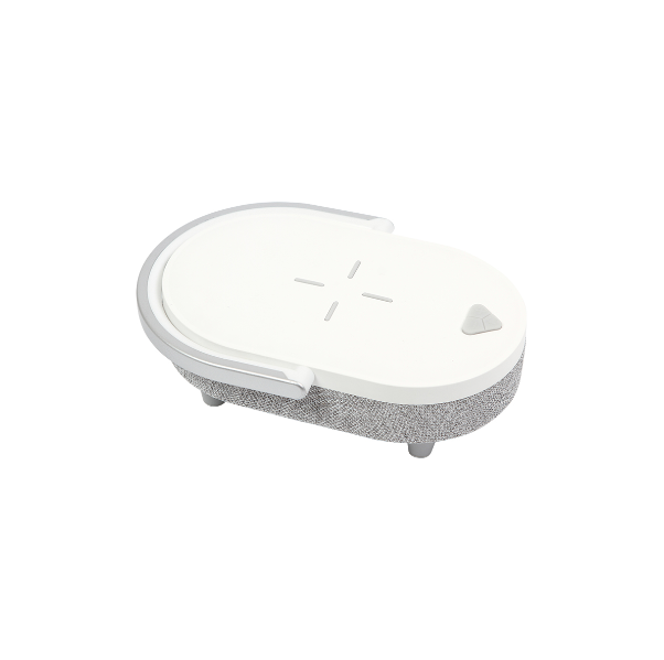 Descripción: Bocina multifunción con cargador inalámbrico con distancia de carga de 8 mm, soporte para teléfono, lámpara de escritorio con luz ajustable, fabricada en PC (plástico de policarbonato), versión Bluetooth 5.3 con una distancia de transmisión de 10 m.