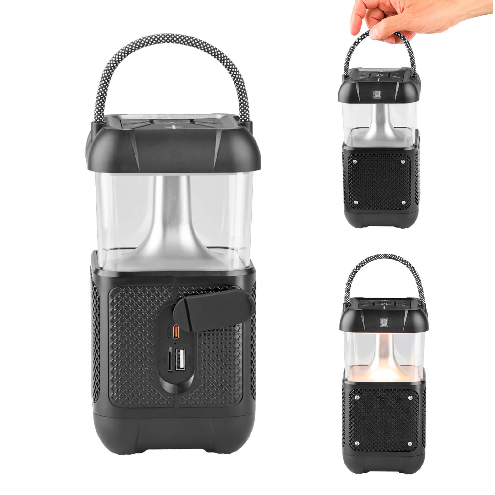 Descripción: Bocina Bluetooth portátil con luz cálida/fría y botones para ajustar los niveles de intensidad. Cuenta con lámpara con luz de emergencia, botón de encendido, radio FM, puerto USB y TF. Incluye cable de carga tipo C.