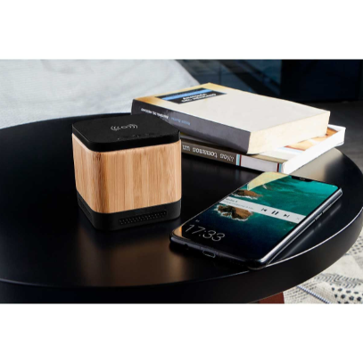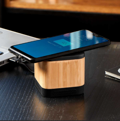 Descripción: Bocina bluetooth con batería recargable. Reproducción de música de 2 hrs aproximadamente. Controles integrados de llamadas, volumen y reproducción de audio. Rango de conexión de 10 metros. La base al estar conectada, funciona como cargador inalámbrico de smartphone. Incluye cable cargador USB.
