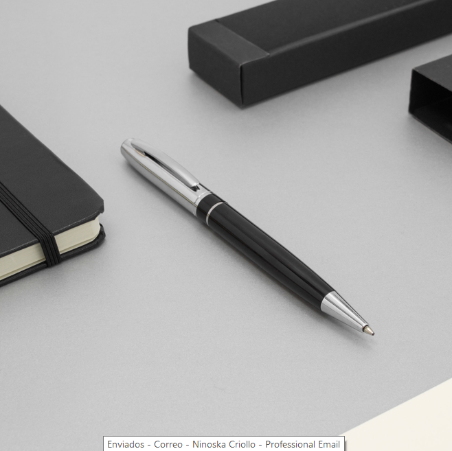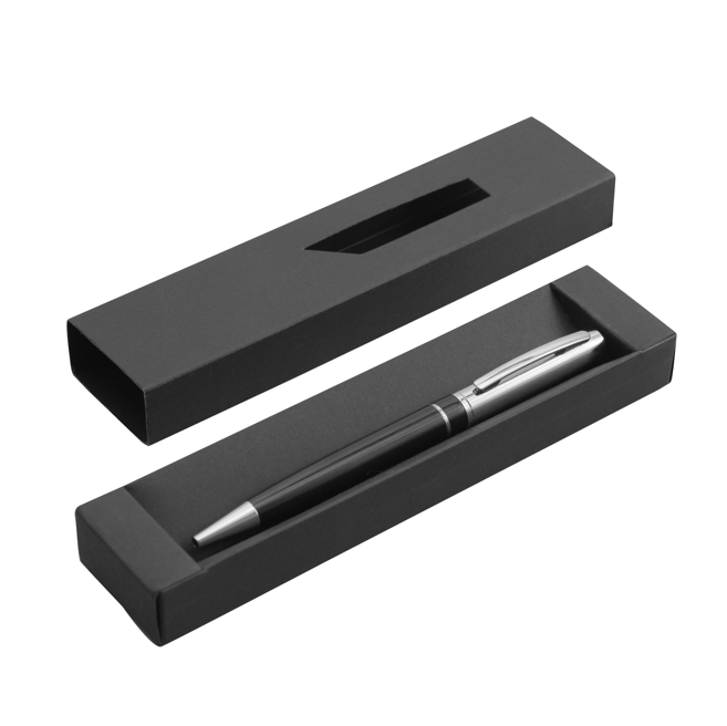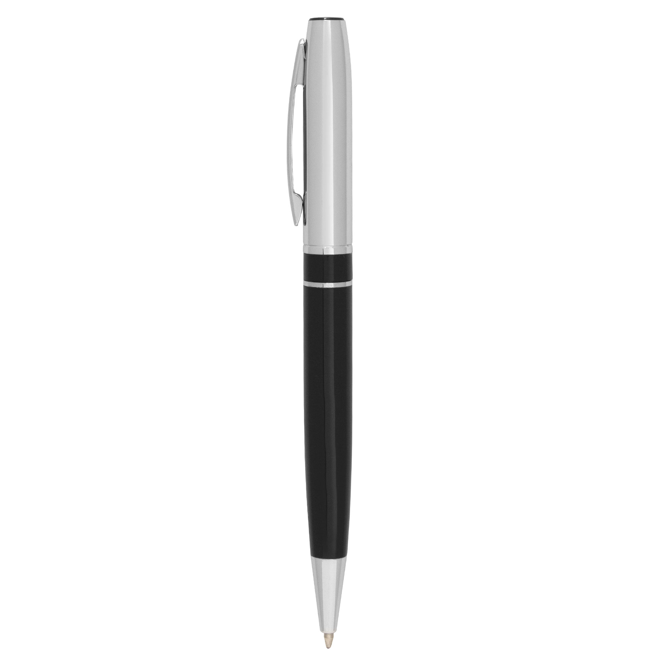 Descripción: Metálico. Cuerpo color negro. Tambor superior, clip, anillo y puntera color plata. Apertura giratoria. Destape plata en la parte superior e inferior. Tinta negra Presentación en caja de regalo.