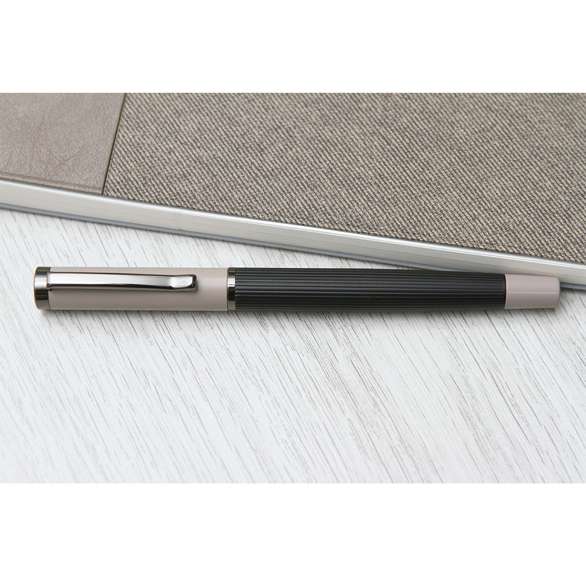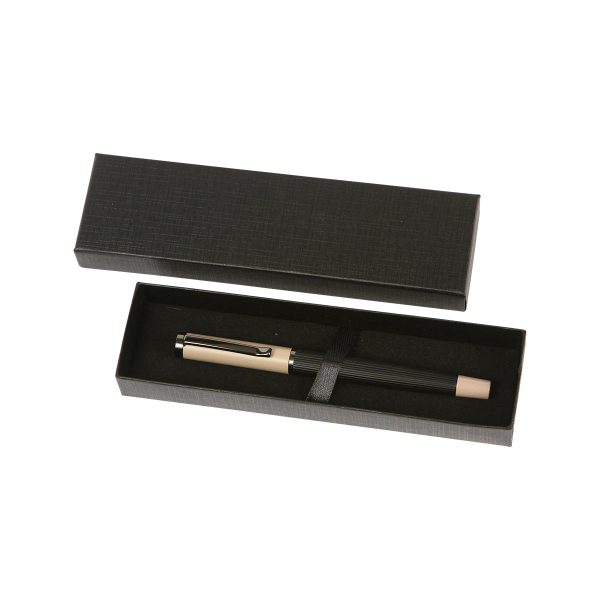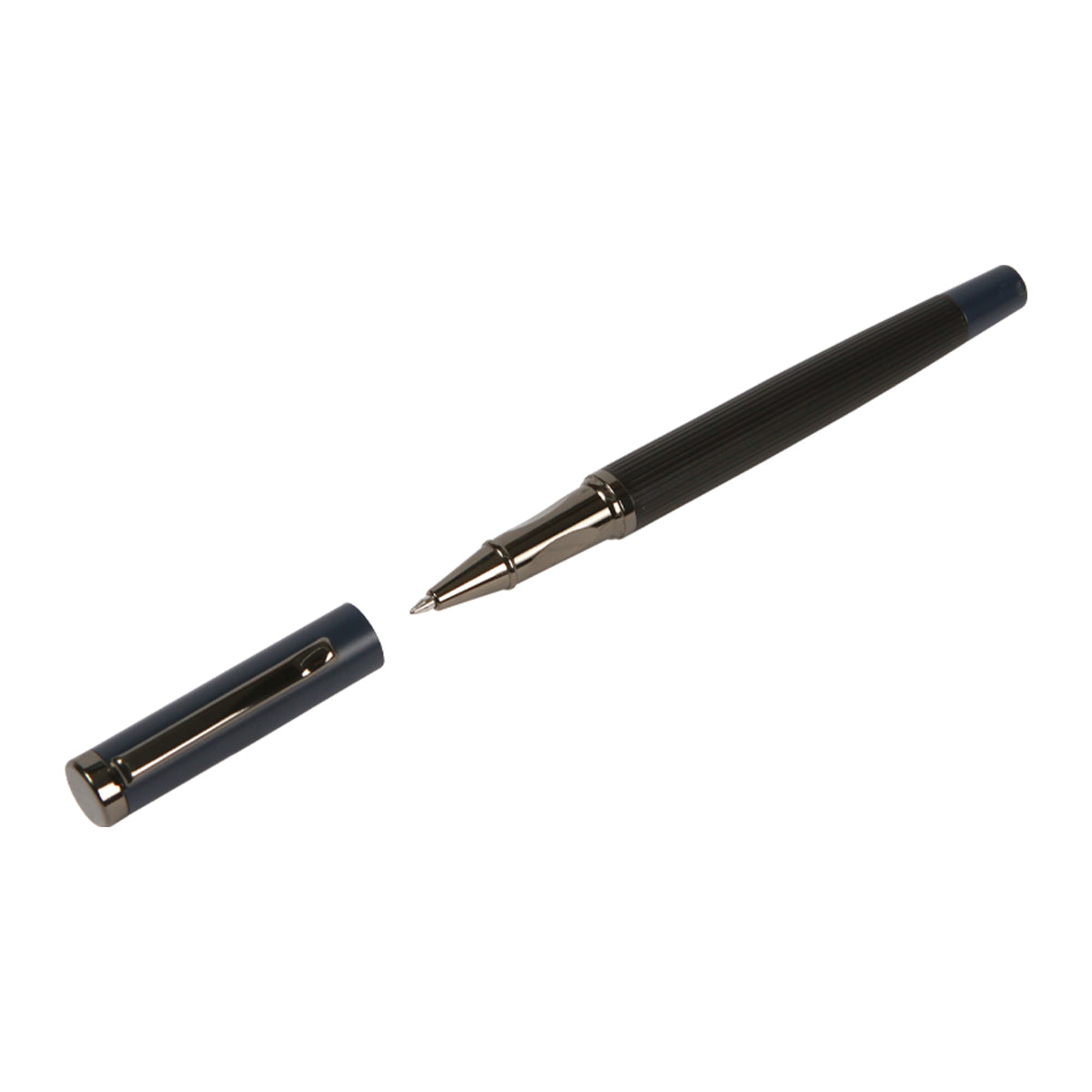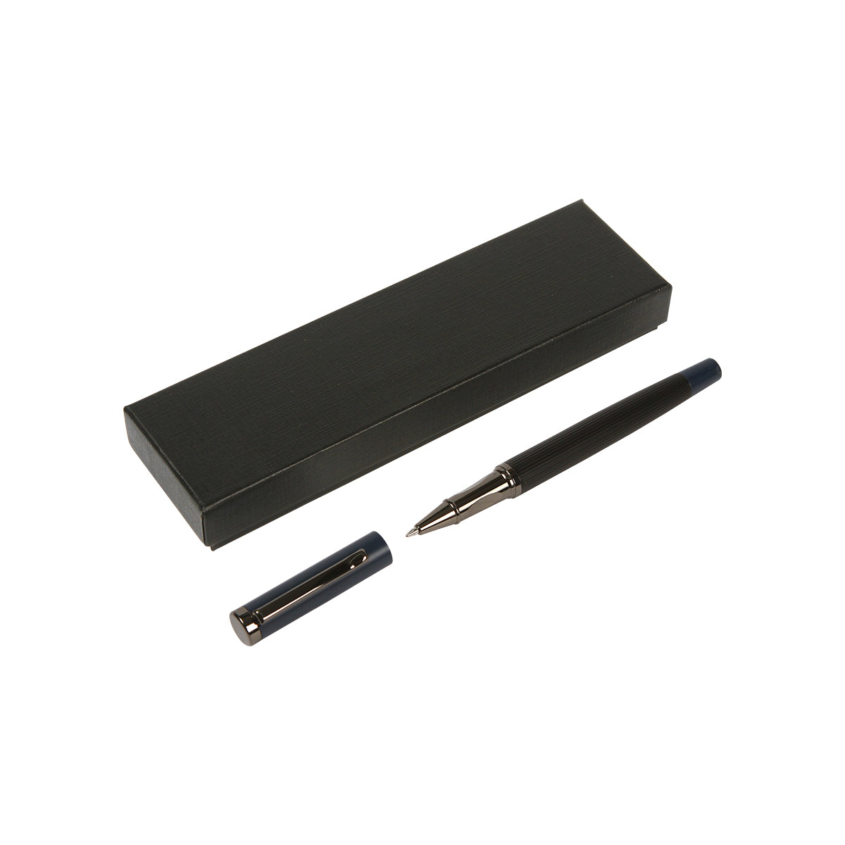 Descripción: Bolígrafo con barril fabricado en acero inoxidable, con detalles en color plateado, tipo roller. Tinta de escritura de gel color azul. Incluye caja de regalo color negro.