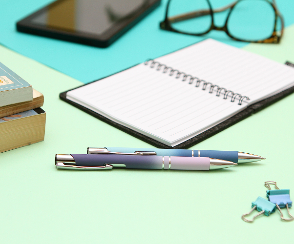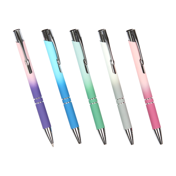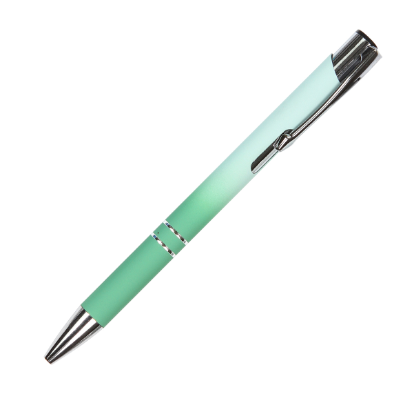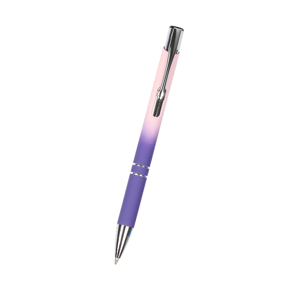 Descripción: Bolígrafo Kongo. Bolígrafo con barril de aluminio de color degradado con acabado de goma, 2 anillos en el cilindro, clip de metal cromado, botón y punta cromados, recambio Parker de plástico y tinta de escritura negra.