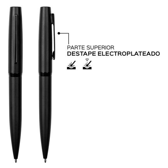 Descripción: Metal. Cuerpo mate. Clip y aro Metálico. Apertura giratoria. Estuche de cartón. Destape electro plateado en la parte superior.