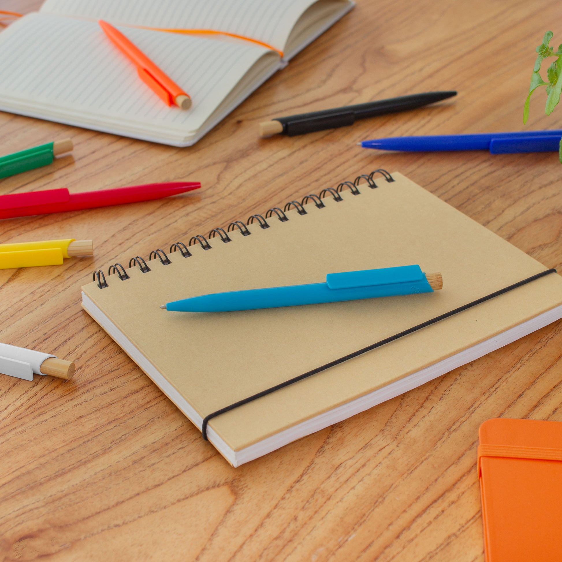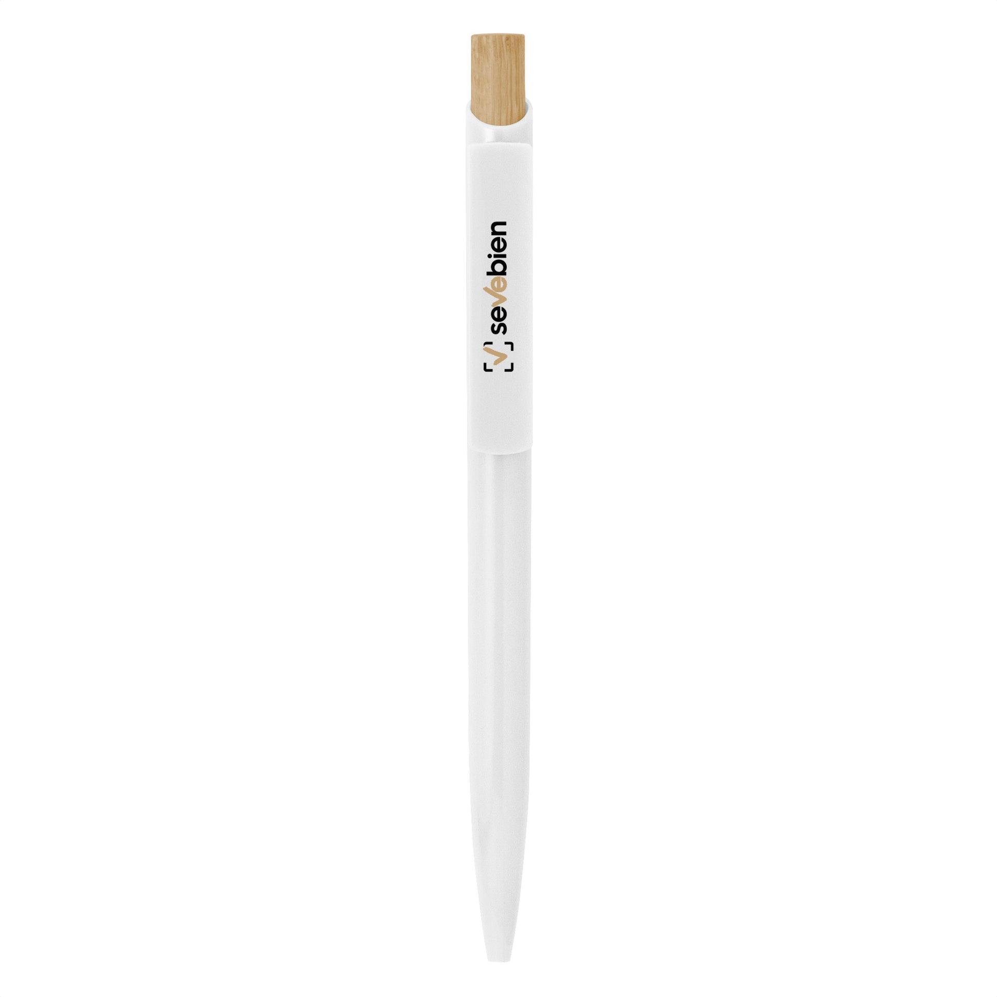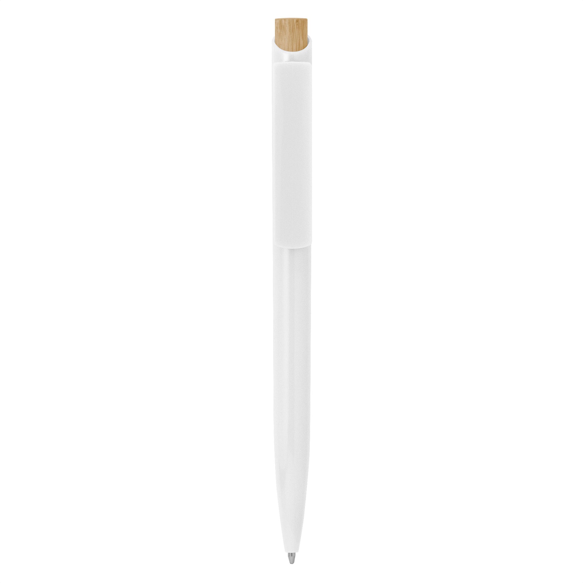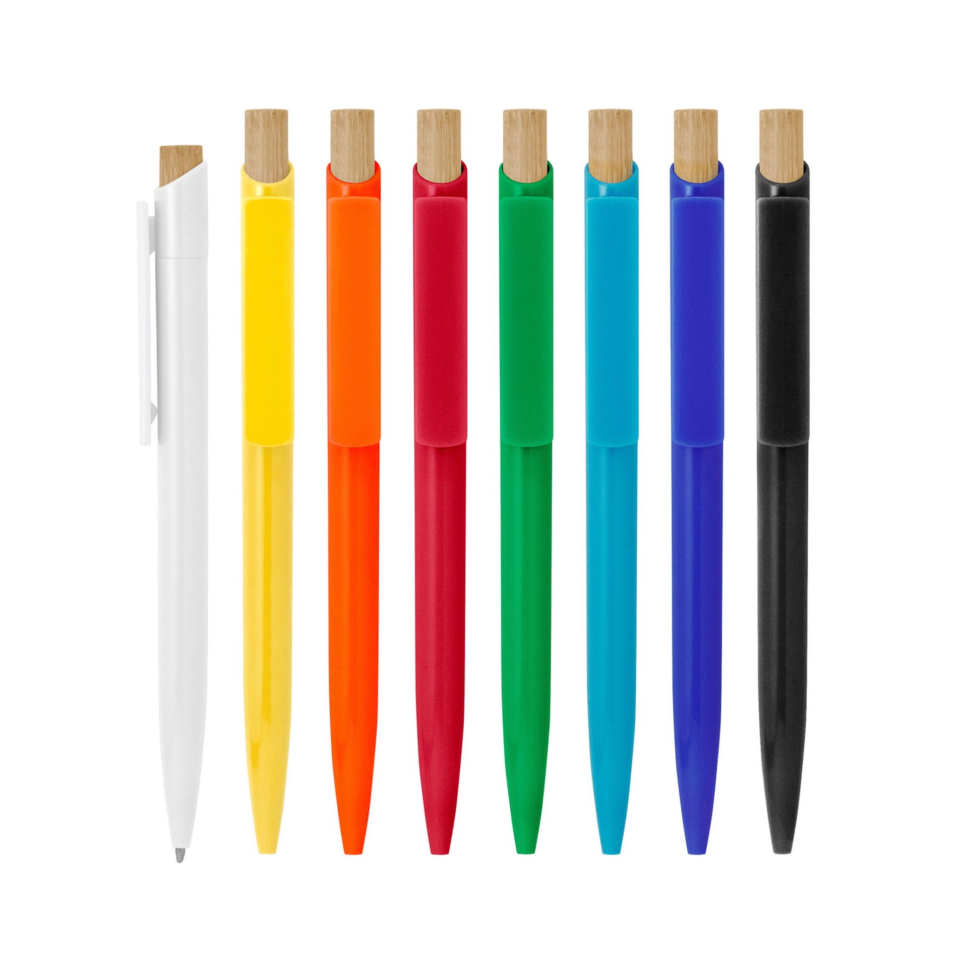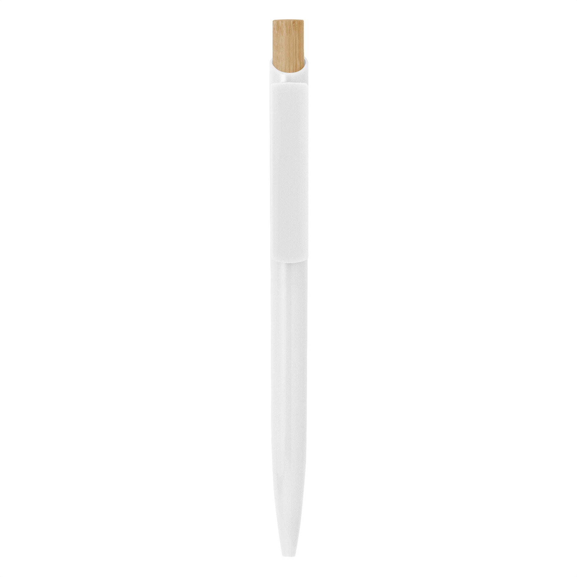 Descripción: Bolígrafo retráctil. Cuerpo de diferentes colores. Pulsador de bambú. Clip del mismo color del cuerpo.