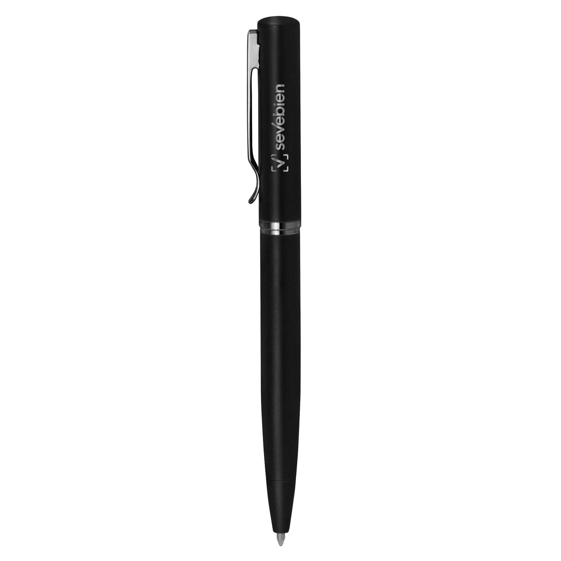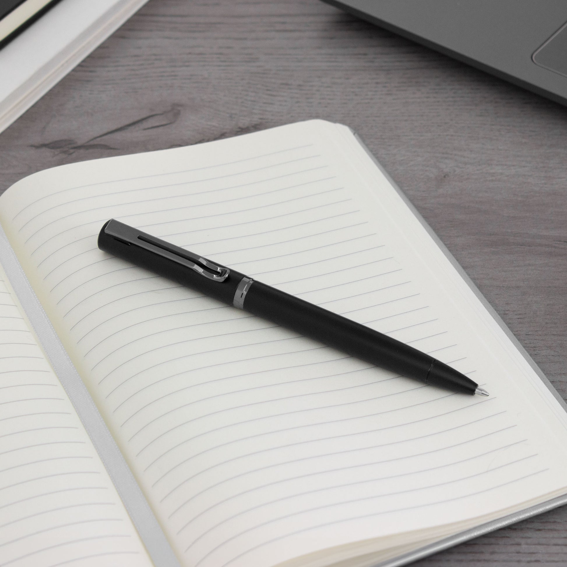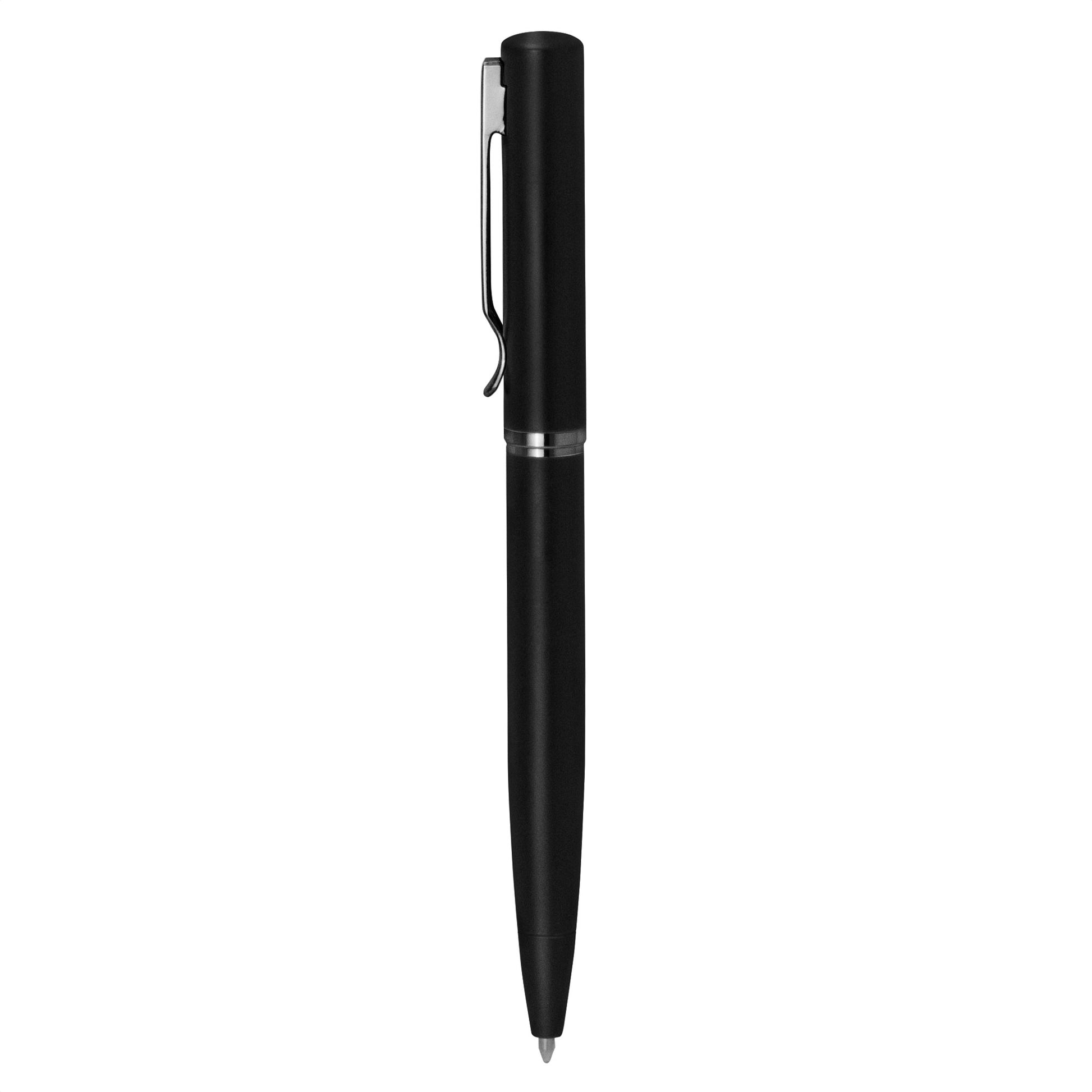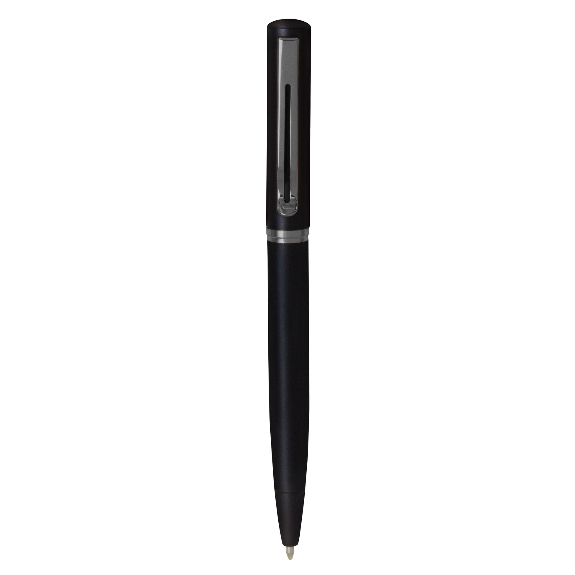 Descripción: Bolígrafo con apertura giratoria. Cuerpo metálico en negro mate. Parte superior de hierro y parte inferior de acero inoxidable. Destape electroplateado en la parte superior. Recarga Parker metálico. Clip y anillos metálicos color gun. presentación en caja de regalo negra.