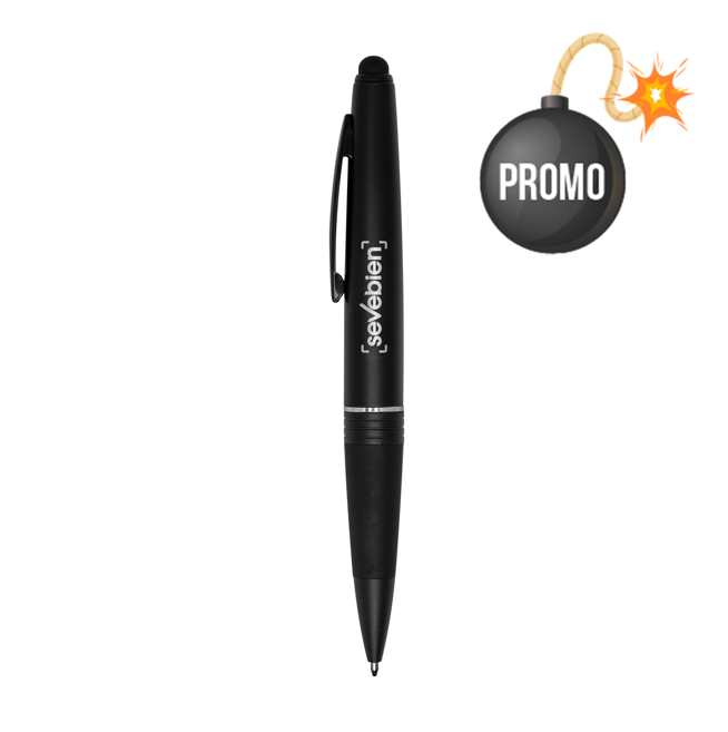 Descripción: Metálico. Bolígrafo touch. Cuerpo color negro mate, electroplateado en parte superior. Clip metalico negro brillante, detalle en color plata. Apertura giratoria. Cartucho metálico.