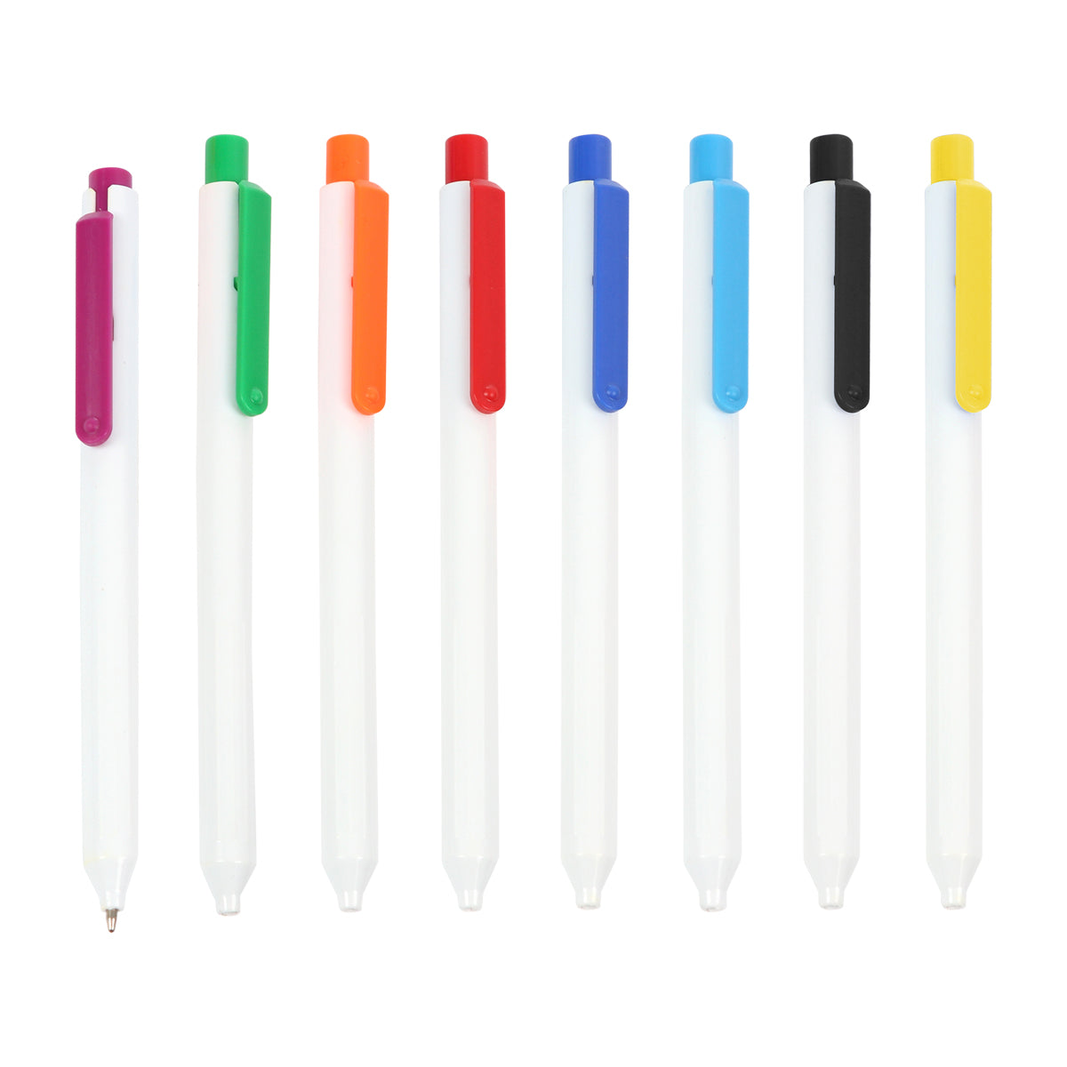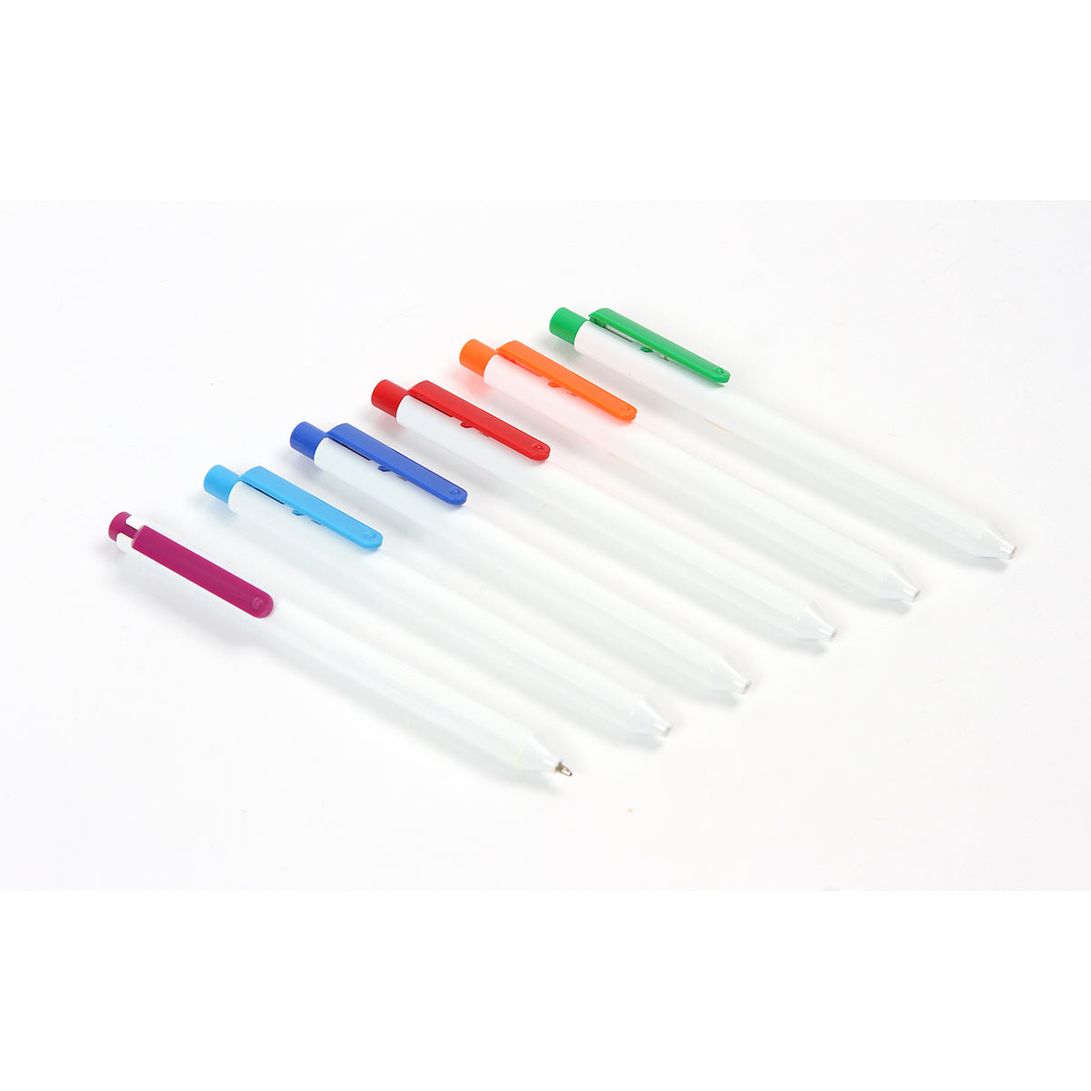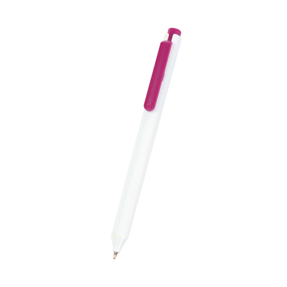 Descripción: Bolígrafo con barril fabricado en plástico ABS color blanco y clip en diferentes colores a elegir, mecanismo de botón. Tinta de escritura color azul.
