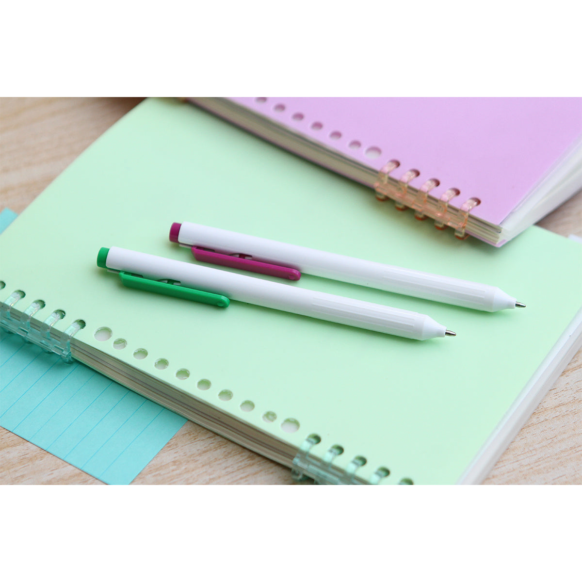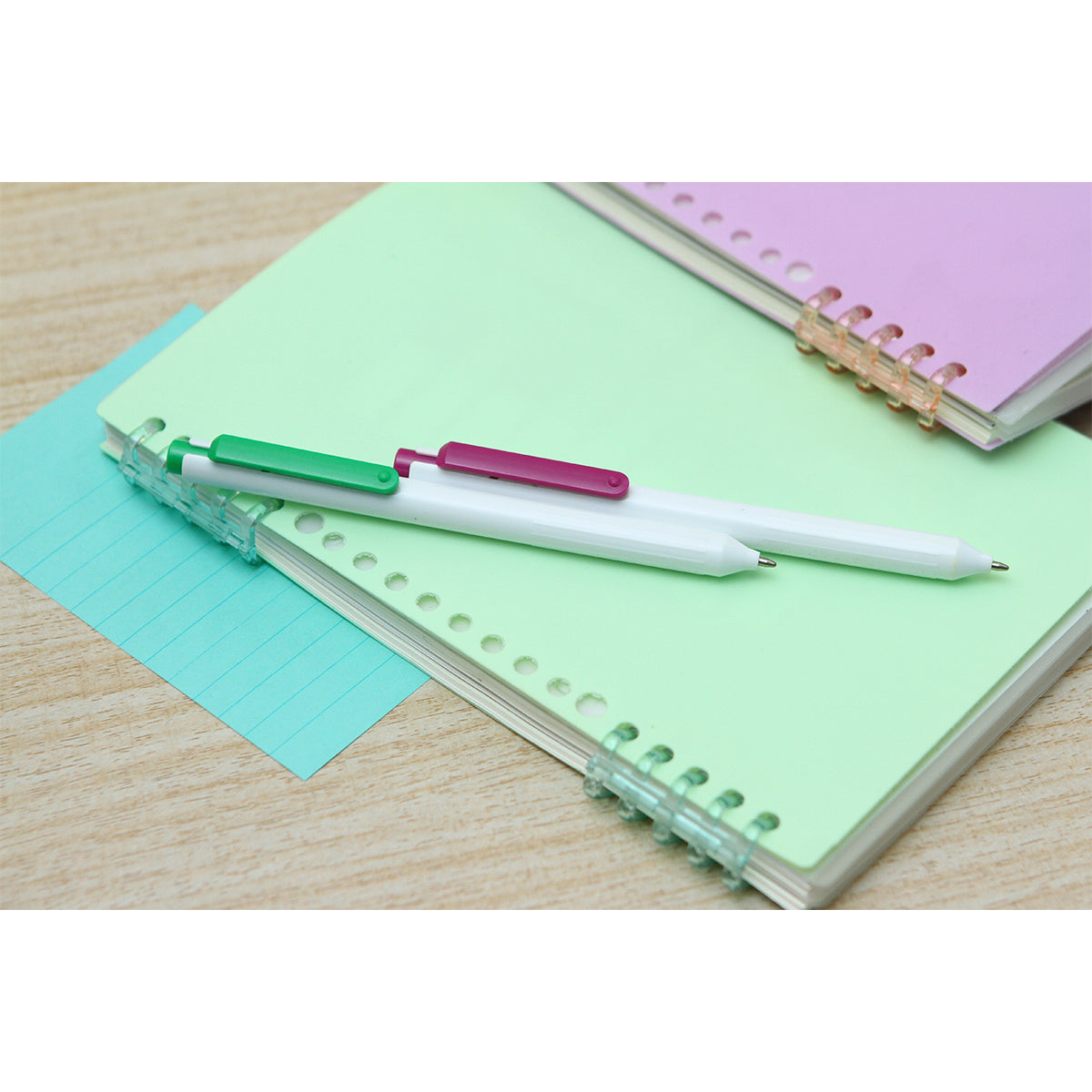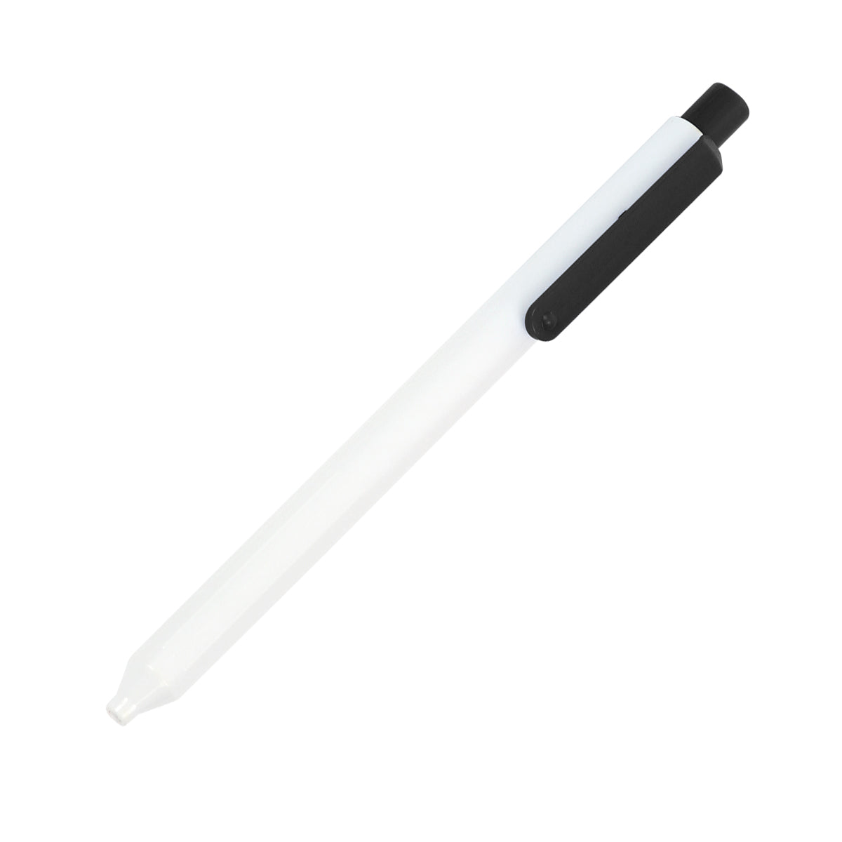 Descripción: Bolígrafo con barril fabricado en plástico ABS color blanco y clip en diferentes colores a elegir, mecanismo de botón. Tinta de escritura color azul.