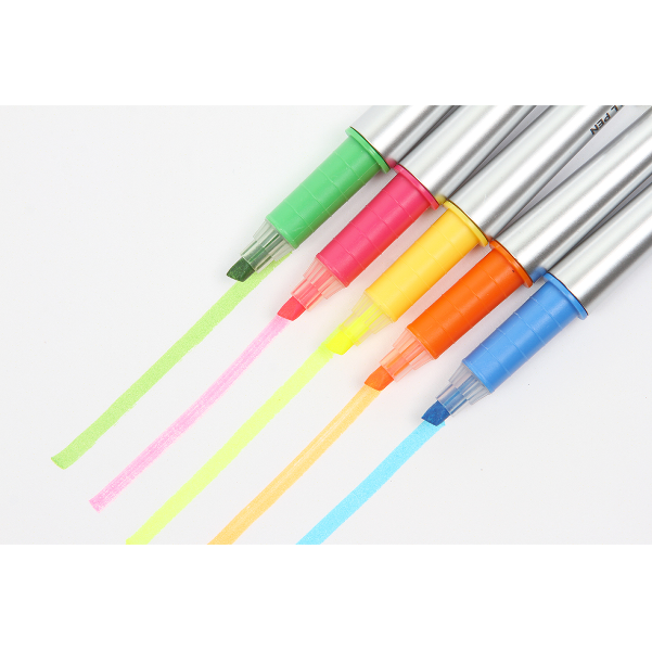 Descripción: Bolígrafo de doble punta, tapa de color translúcido, cuerpo de plástico esterilizado en tono plateado, punta rociada metálica, lápiz óptico resaltador de color en la parte superior, bolígrafo en el otro, recambio delgado X-20. Material: barril de ABS, tapa de PP. Tinta de escritura negra.