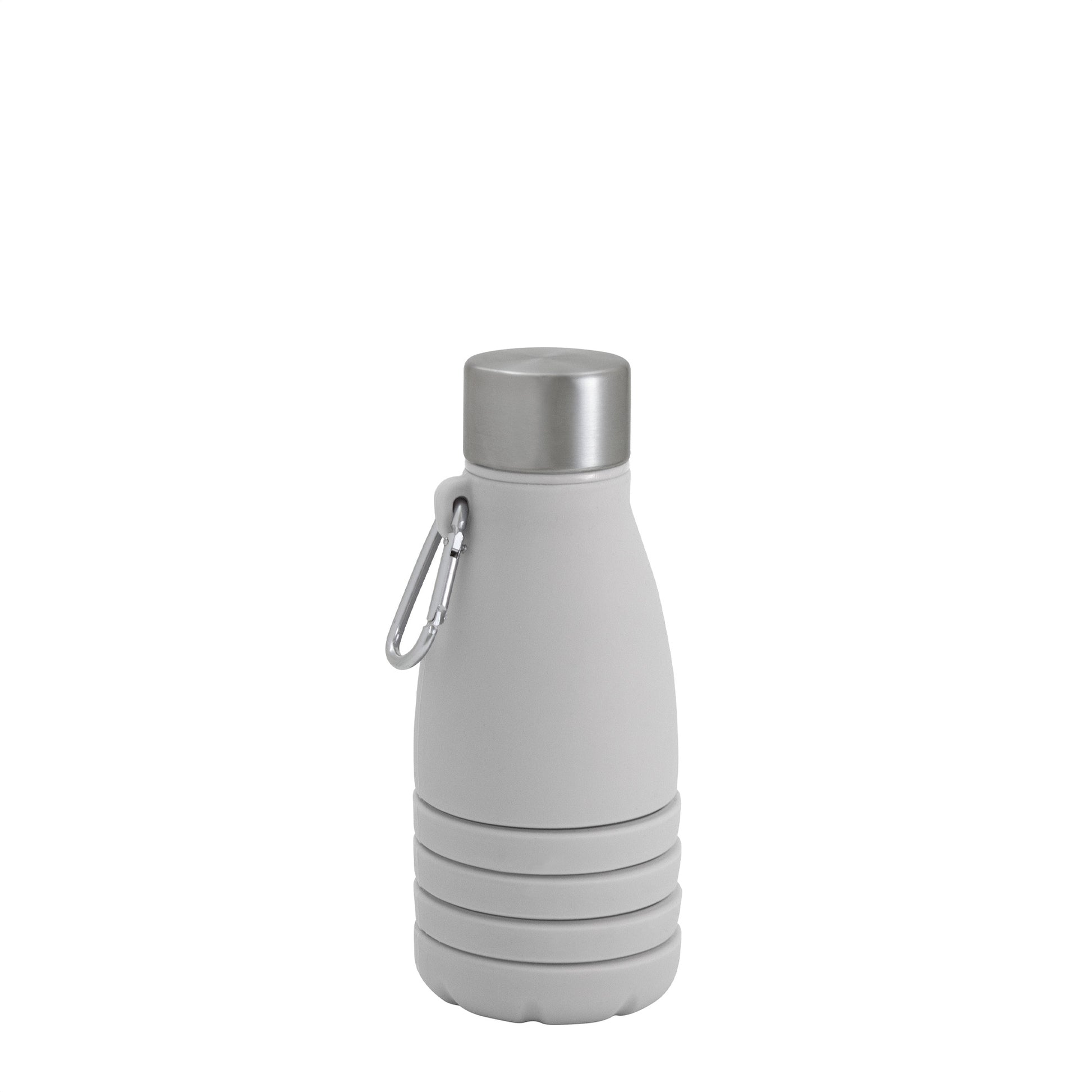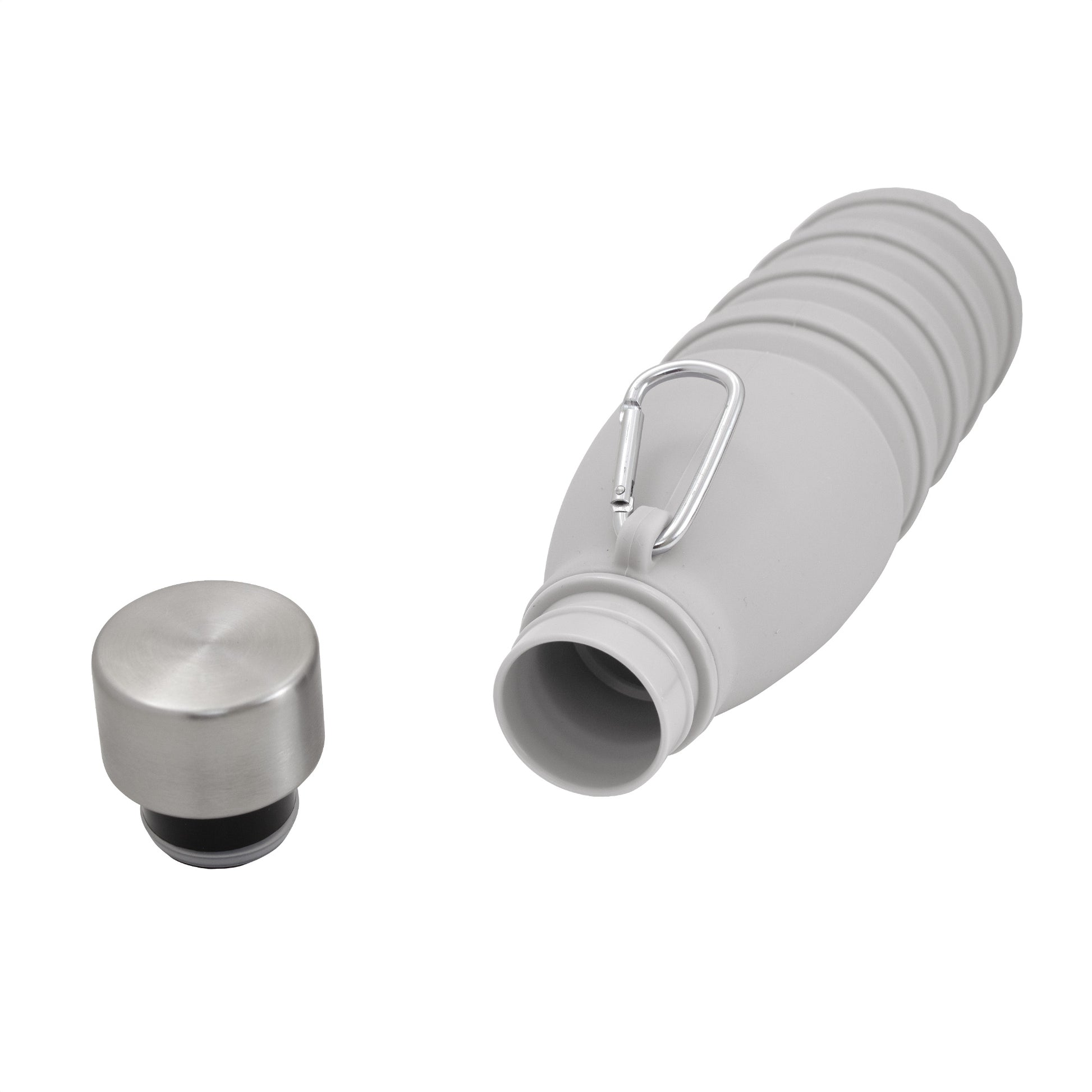 Descripción: Botella plegable que reduce su tamaño a 17 cm cuando está vacía, ocupando un mínimo espacio en tu mochila o bolso. Boca de botella plástica. Tapa de acero inoxidable 201 y mosquetón de aluminio plateado. Para ajustar el tamaño de la botella, simplemente retira la tapa y ajusta la altura según tus necesidades.