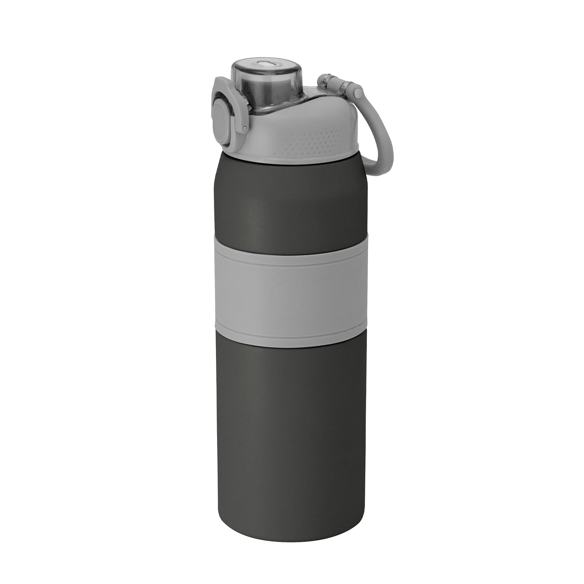 Descripción: Botella deportiva con doble pared, sellada al vacío. Interior de acero 304 y exterior de acero 201. Pintura powder coat (pintura más duradera y resistente a la corrosión y el paso del tiempo). Tapa plástica a rosca en color gris con anillo de silicona y manija plástica para su agarre, combinada con tapa rebatible en colores translucidos a juego con el color de la botella. Boquilla con sorbete incluido. Grip de silicona color gris para mejor agarre. Mantiene alrededor de 8 hs la temperatura de las bebidas calientes y frías. Presentación en caja de regalo kraft.