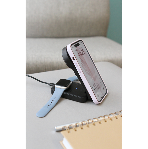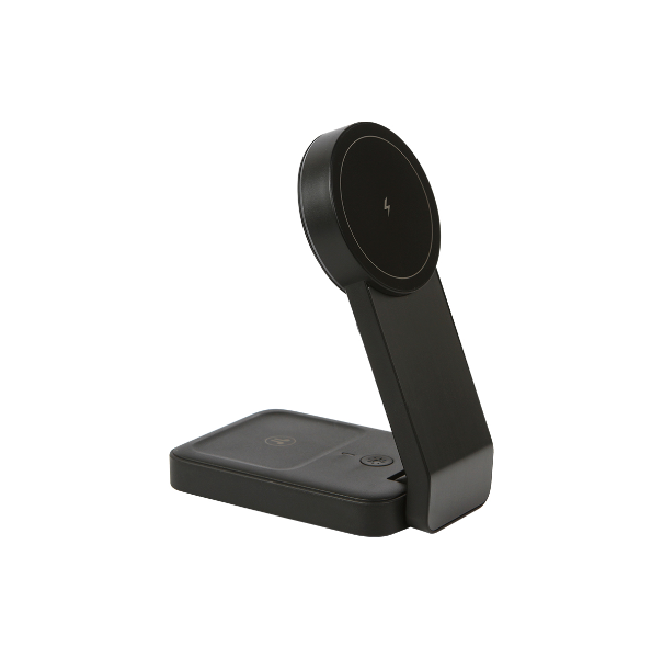 Descripción: Cargador inalámbrico fabricado en plástico y aluminio plegable 4 en 1 ( carga celular, audífonos y reloj inteligente) con luz nocturna.