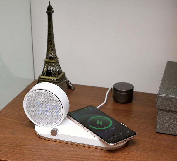 Descripción: Cargador inalámbrico con reloj con cubierta de tela y luz nocturna táctil ajustable de 3 niveles de 15 w, (la luz nocturna está en la base). Este producto tiene un diseño creativo y ergonómico. Puede ser usado en el hogar y en el trabajo. Este producto es compatible cualquier dispositivo móvil con tecnología Qi, que soporte cargas de 5W-7.5W-10W-15W de carga rápida.