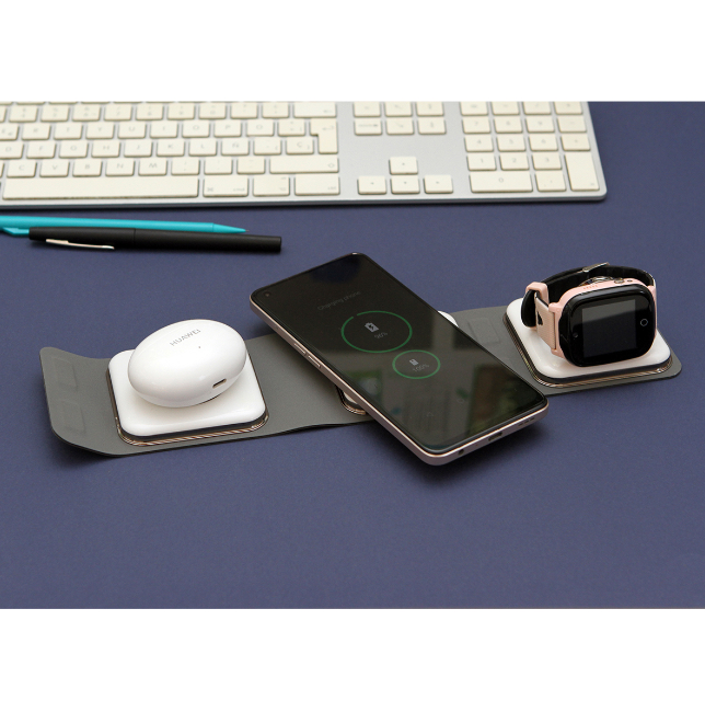 Descripción: Cargador magnético inalámbrico 3 en 1, con diseño desdoblable para uso más práctico, sirve para teléfono móvil, reloj inteligente y audífonos inalámbricos.