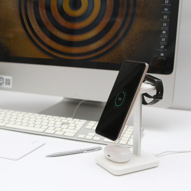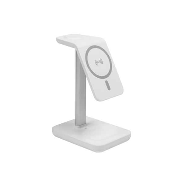 Descripción: Cargador inalámbrico 3 en 1 (reloj, teléfono móvil y audífonos), fabricado en plástico ABS y metal, carga a través de cable USB (incluido). Incluye caja de cartón individual.