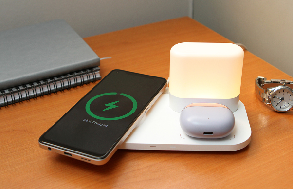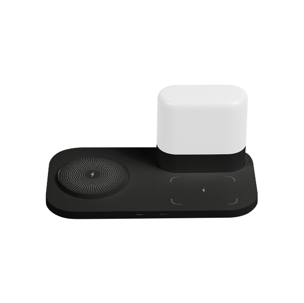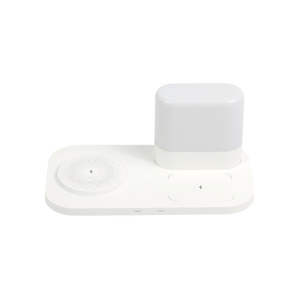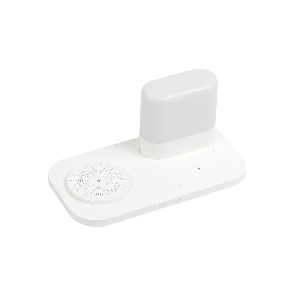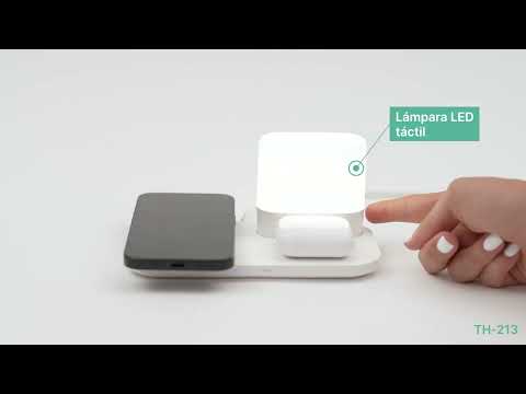 Descripción: Cargador inalámbrico fabricado en plástico 4 en 1 (celular, lámpara, audífonos y reloj inteligente) de 15 w con lámpara led táctil e interfaz de carga adicional para smart watch.