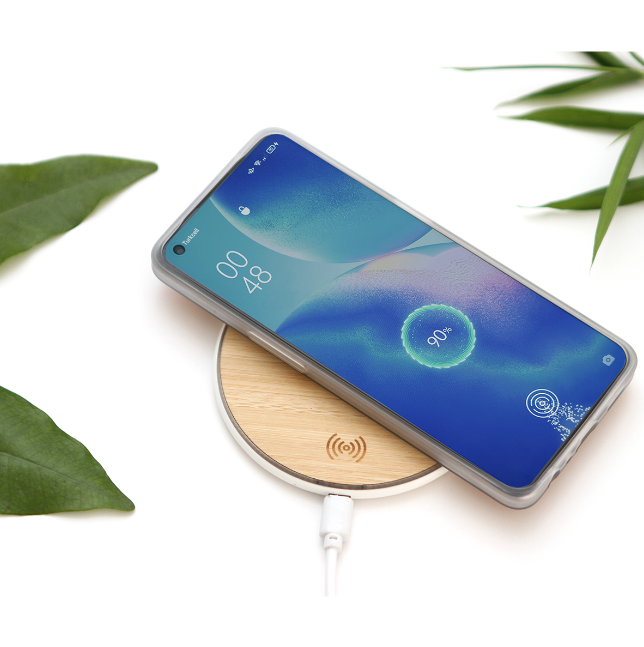 Descripción: Cargador inalámbrico de 10 W con tecnología Qi, fabricado en bambú y plástico ABS. Incluye cable USB y caja de cartón individual.