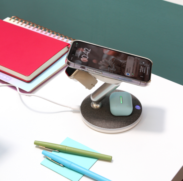 Descripción: Cargador inalámbrico 3 en 1 , esta estación de carga rápida permite cargar tu teléfono, reloj y audífonos al mismo tiempo, funciona con dispositivos con tecnología Qi. Se puede plegar para ahorrar espacio siendo ideal para viajes, hogar u oficina. Incluye cable y caja de cartón individual