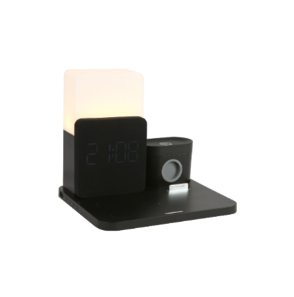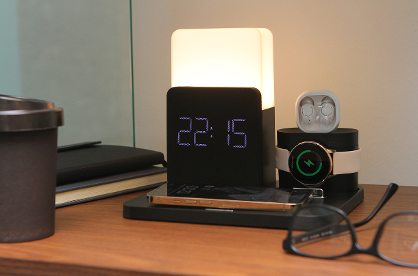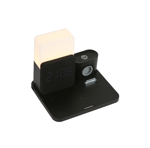 Descripción: Cargador inalámbrico con luz nocturna y potencia de hasta 15W. Incluye función de reloj con alarma. Cuenta con zonas de carga para audífonos inalámbricos, reloj inteligente y teléfono celular. Diseño ergonómico especializado para escritorio. .