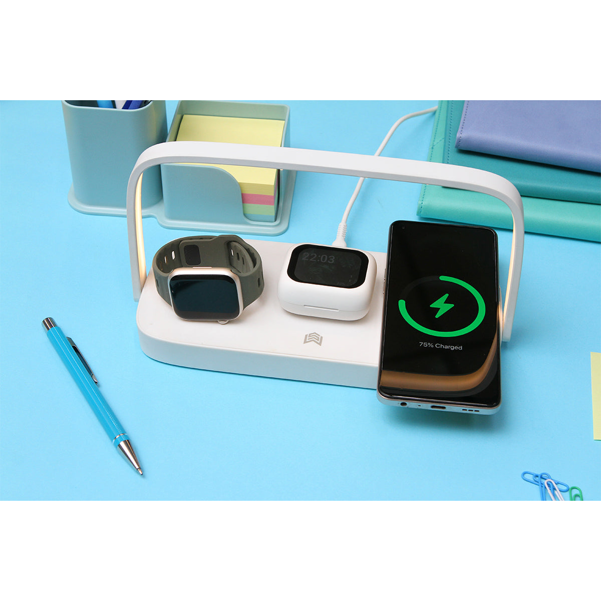 Descripción: Cargador inalámbrico fabricado en ABS y plástico de policarbonato (PC), compatible con celular, reloj, y audífonos. Potencia de carga de 5w/7,5w/10w/15w para celular, 2,5w para reloj inteligente y 3W para audífonos inalámbricos. Incluye manija y función de luz nocturna.