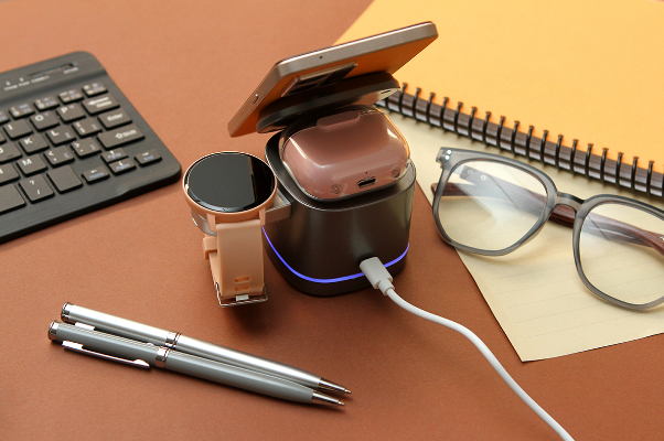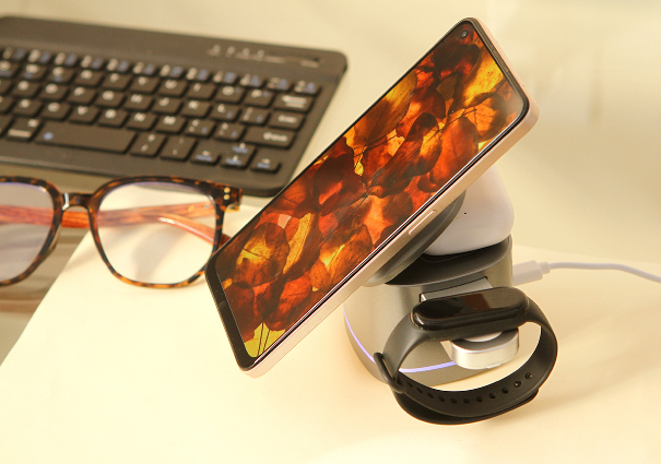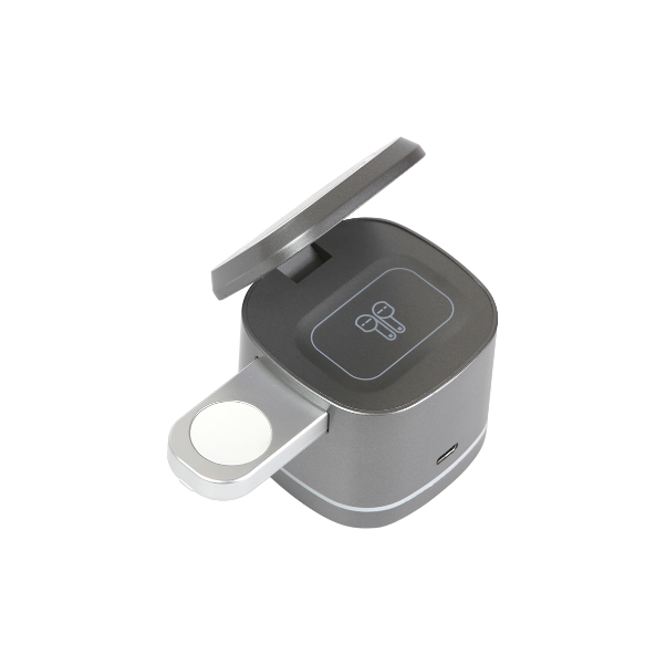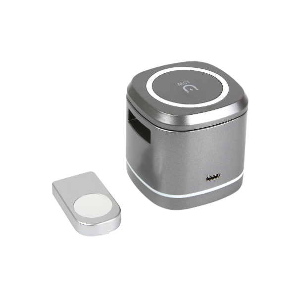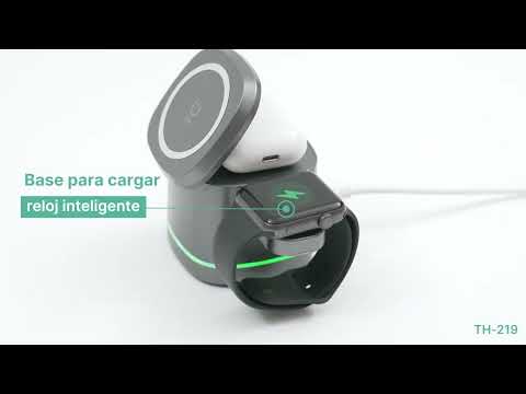 Descripción: Cargador inalámbrico fabricado en ABS y plástico de policarbonato (PC), compatible con celular, reloj, y audífonos. Potencia de carga de 5w/7,5w/10w/15w para celular, 2,5w para reloj inteligente y 3w para audífonos inalámbricos.