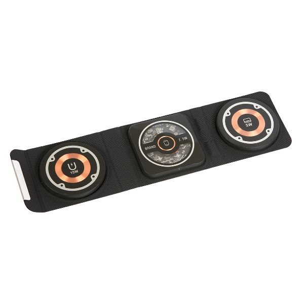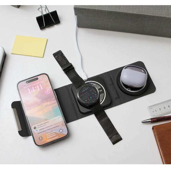 Descripción : Cargador magnético para casa, oficina o viaje 3 en 1 plegable wireless de 15 w, material plástico ABS+PU, para celular, audífonos y reloj, carga rápida, multi función, compacto y fácil de transportar.