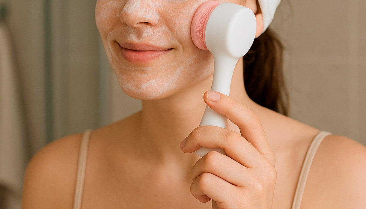 Descripción: Cepillo limpiador facial de doble cara con mango ergonómico.