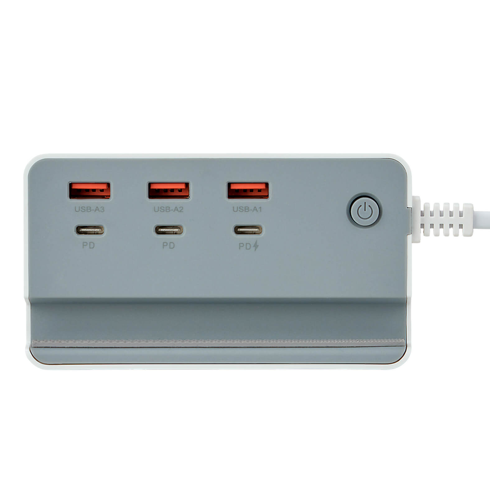 Descripción: Concentrador de plástico con tres puertos USB, tres puertos Tipo C, botón de encendido/apagado y cable de conexión universal.