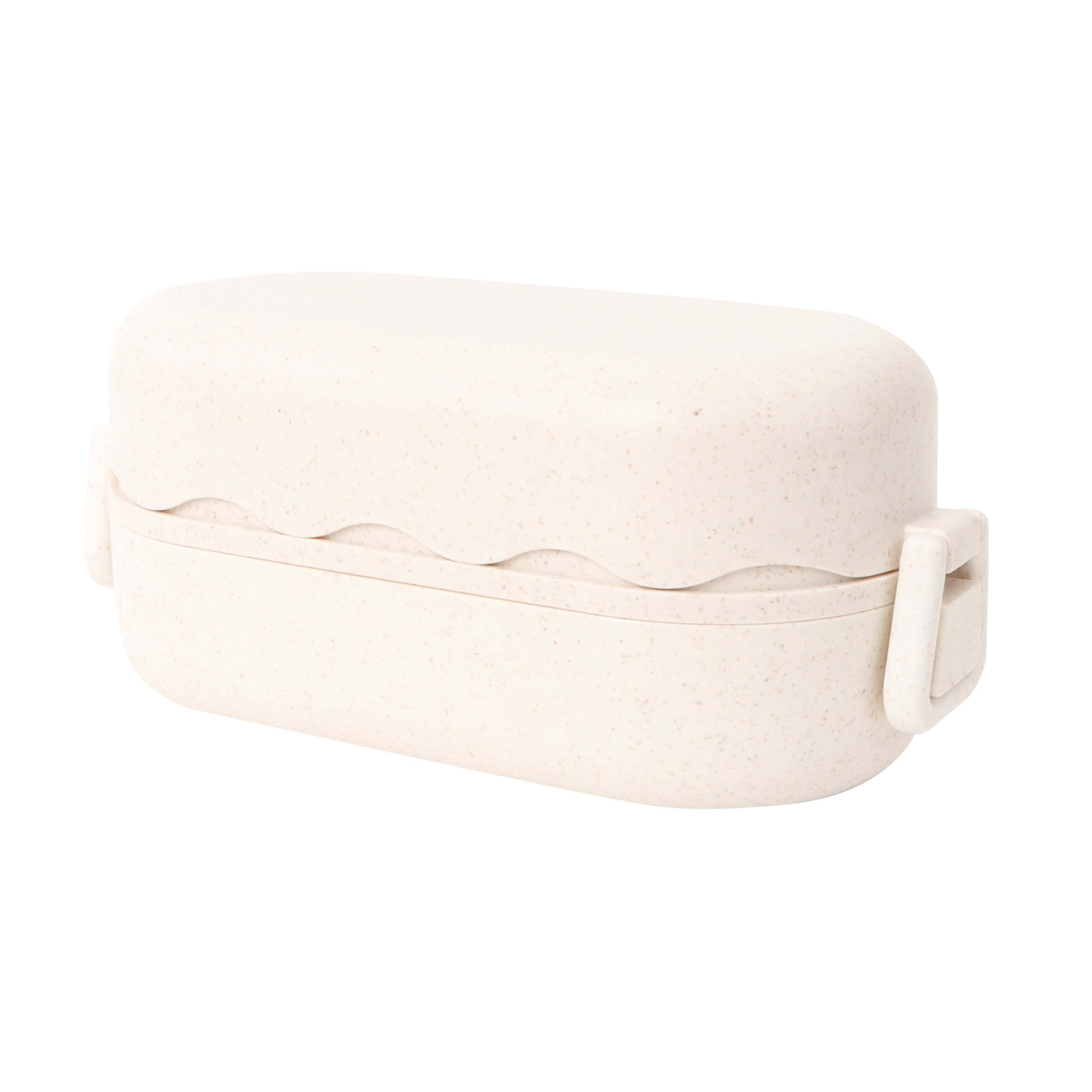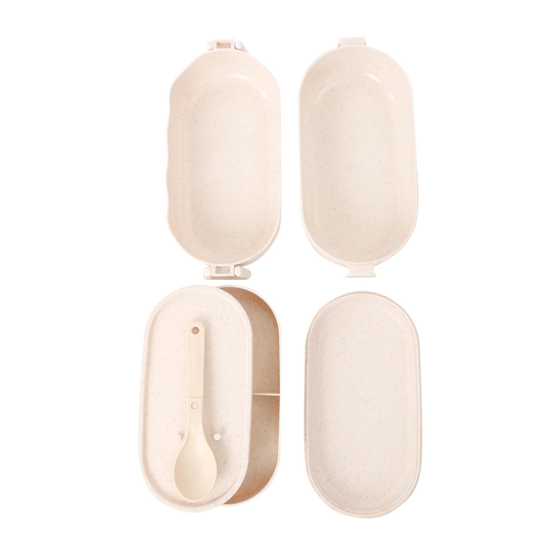 Descripción: Contenedor de alimentos con dos compartimentos principales, separador de comida, cuchara y broches laterales.