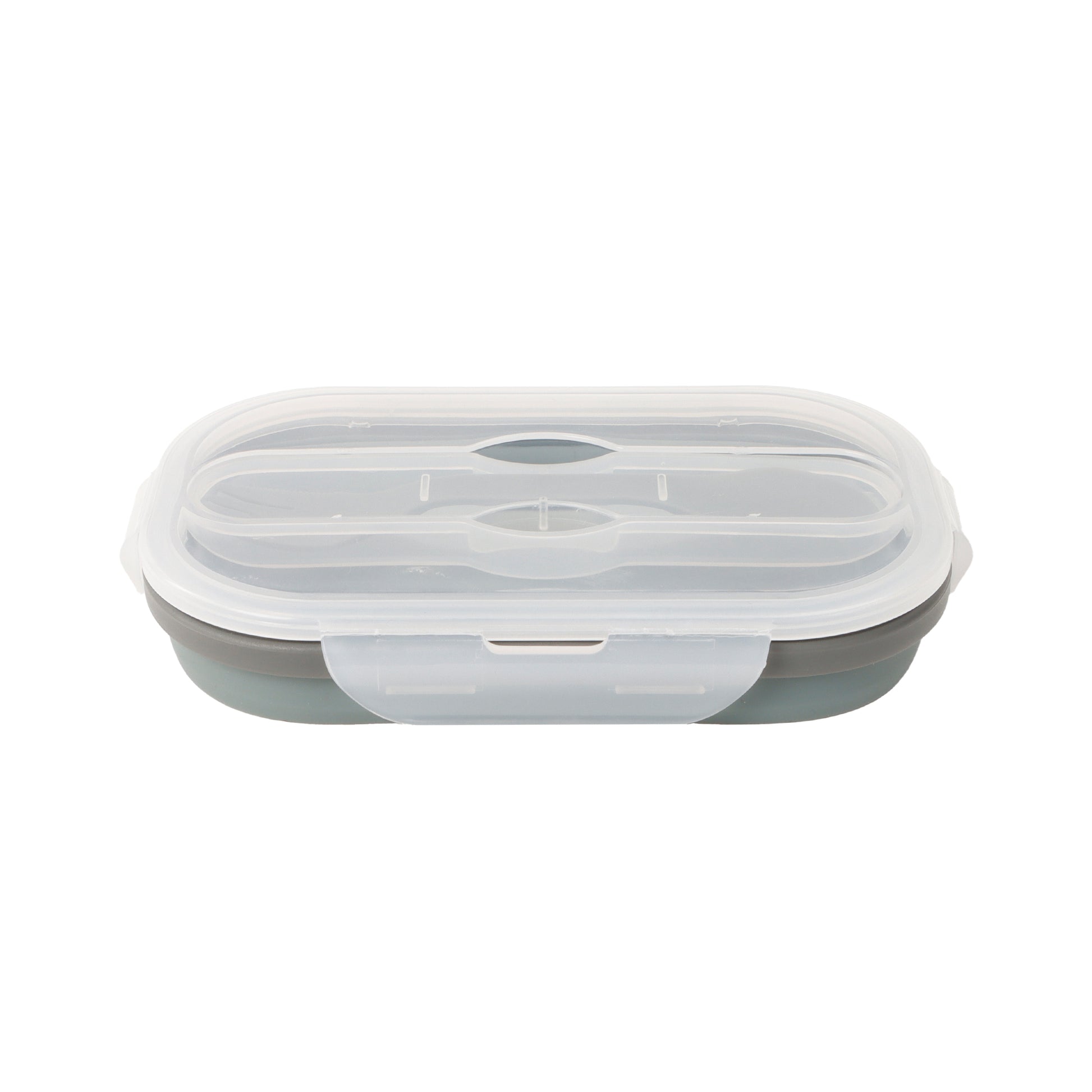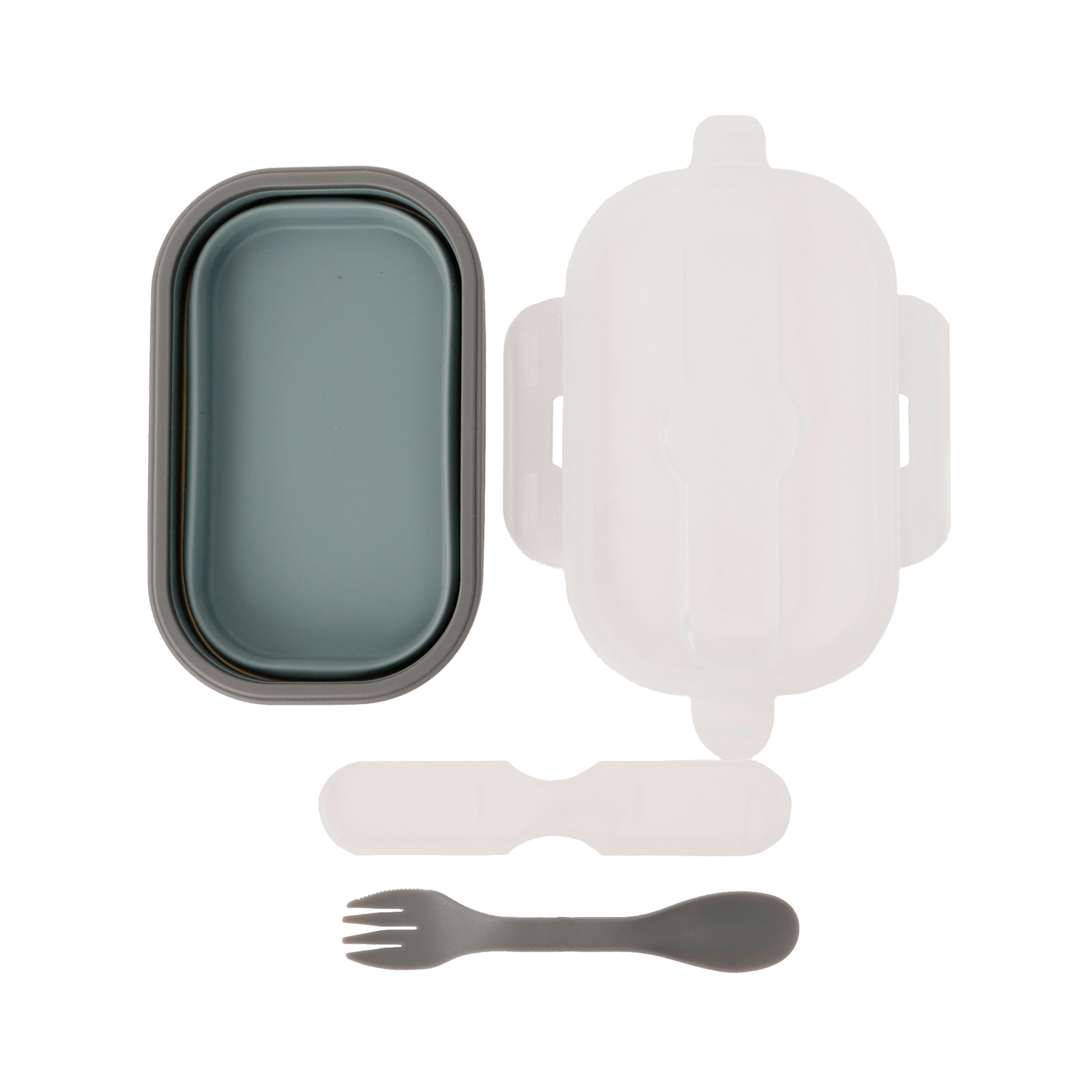 Descripción: Contenedor de alimentos de silicona plegable con cierre hermético y utensilios.