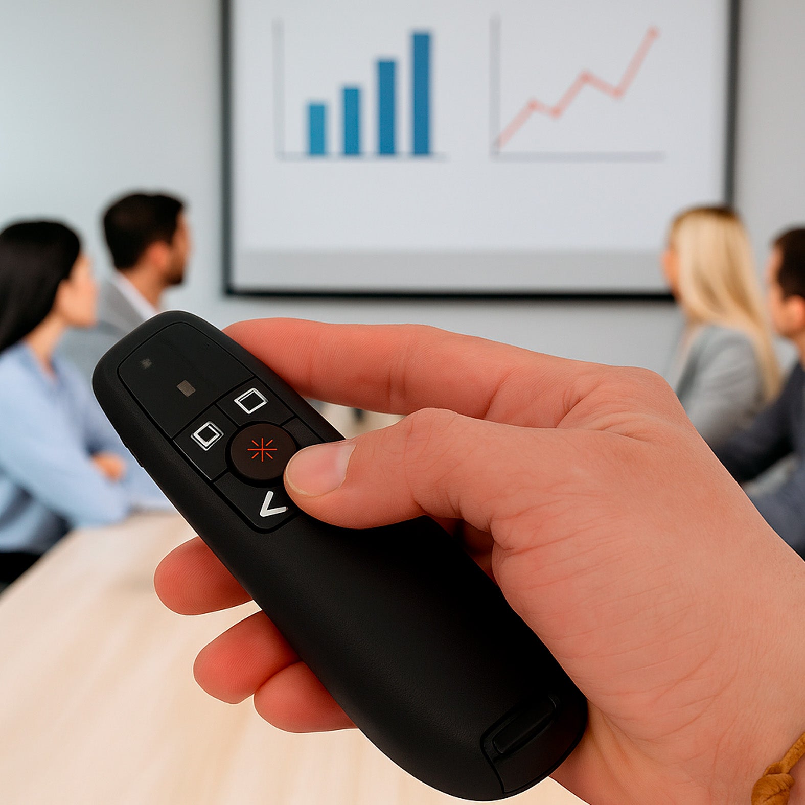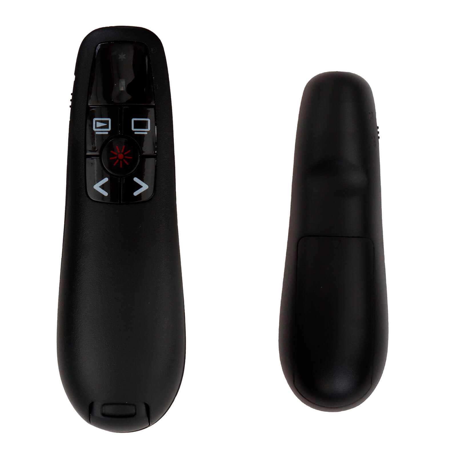 Descripción: Control inalámbrico para presentaciones con apuntador láser, receptor USB y tipo C, botón de cambio, encendido y apagado.