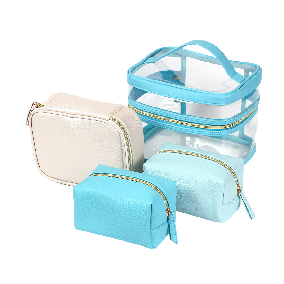 Descripción: Organiza tus cosméticos y accesorios con estilo con este completo juego de 4 cosmetiqueras diseñadas para adaptarse a todas tus necesidades. Cada pieza combina funcionalidad con un diseño moderno en colores que hacen juego, perfectas para viajar o mantener todo en orden en casa. Incluye una cosmetiquera fabricada en PVC transparente con asa superior y cierre ideal para llevar todo a la vista y con fácil acceso. 1 cosmetiquera mediana en curpiel, con cierre y estructura resistente, perfecta para uso diario. 2 cosmetiqueras pequeñas también en curpiel, ideales para objetos más compactos como labiales, joyería o artículos de tocador. Un set funcional y con estilo que se adapta a cada ocasión. ¡Llévalo contigo y mantén tus esenciales siempre organizados!