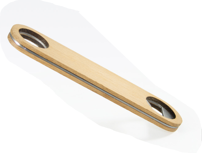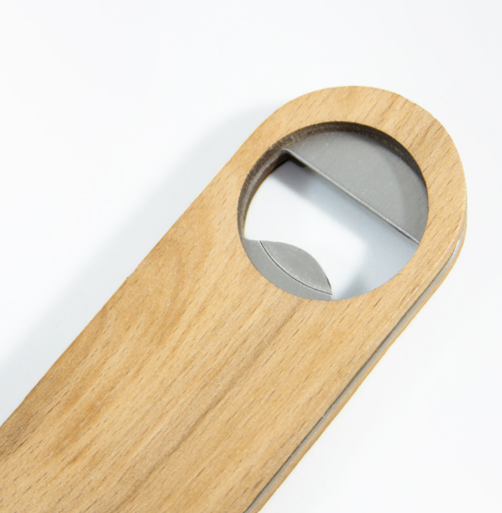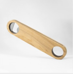 Descripción: Destapador metálico con colgador/agarradera y cubierta de madera.