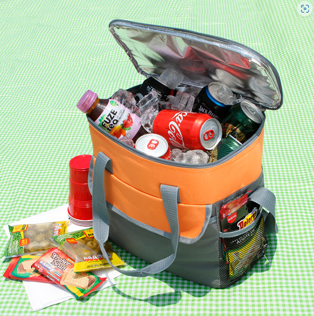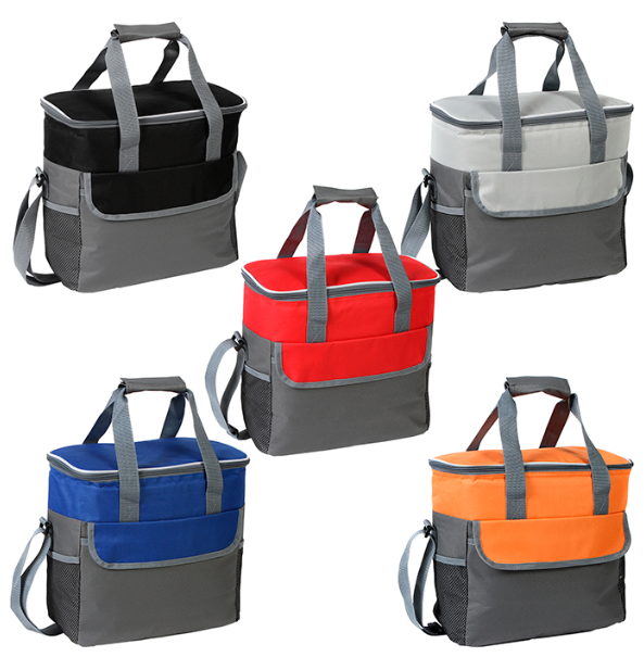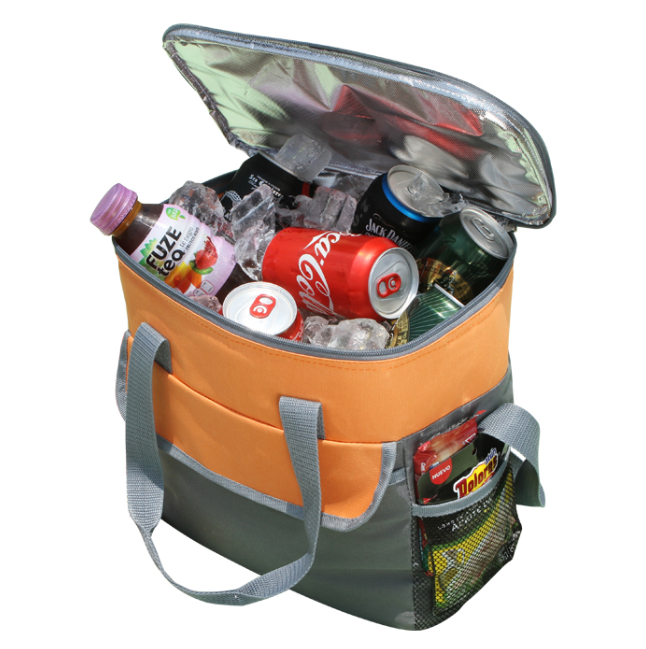 Descripción: Hielera fabricada en poliéster 600D con forro de PVC y aluminio, compartimento frontal con bolsas laterales de malla, asas superiores y correa para hombro, Capacidad para 16 latas .