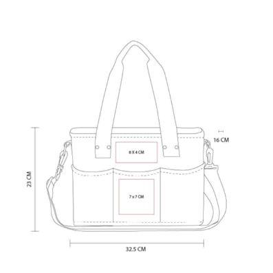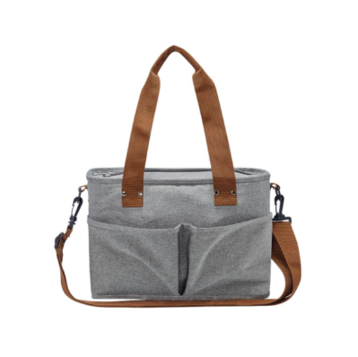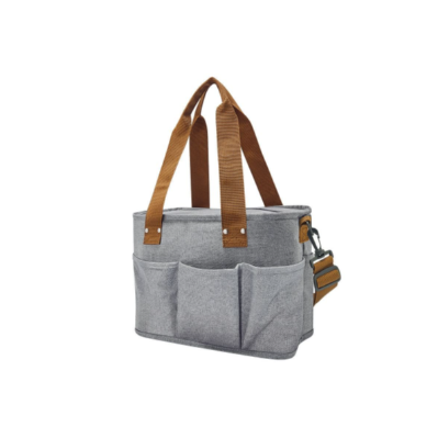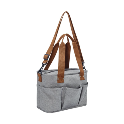 Descripción: Hielera con interior plastificado impermeable. Bolsillo principal con cierre, 3 bolsillos frontales y 2 bolsillos posteriores. Asa ajustable con broches de plástico.