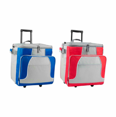 Descripción: Interior plastificado impermeable. Bolsa frontal y 2 compartimentos con cierre. Agarraderas laterales. Mecanismo trolley. Capacidad para 40 latas.