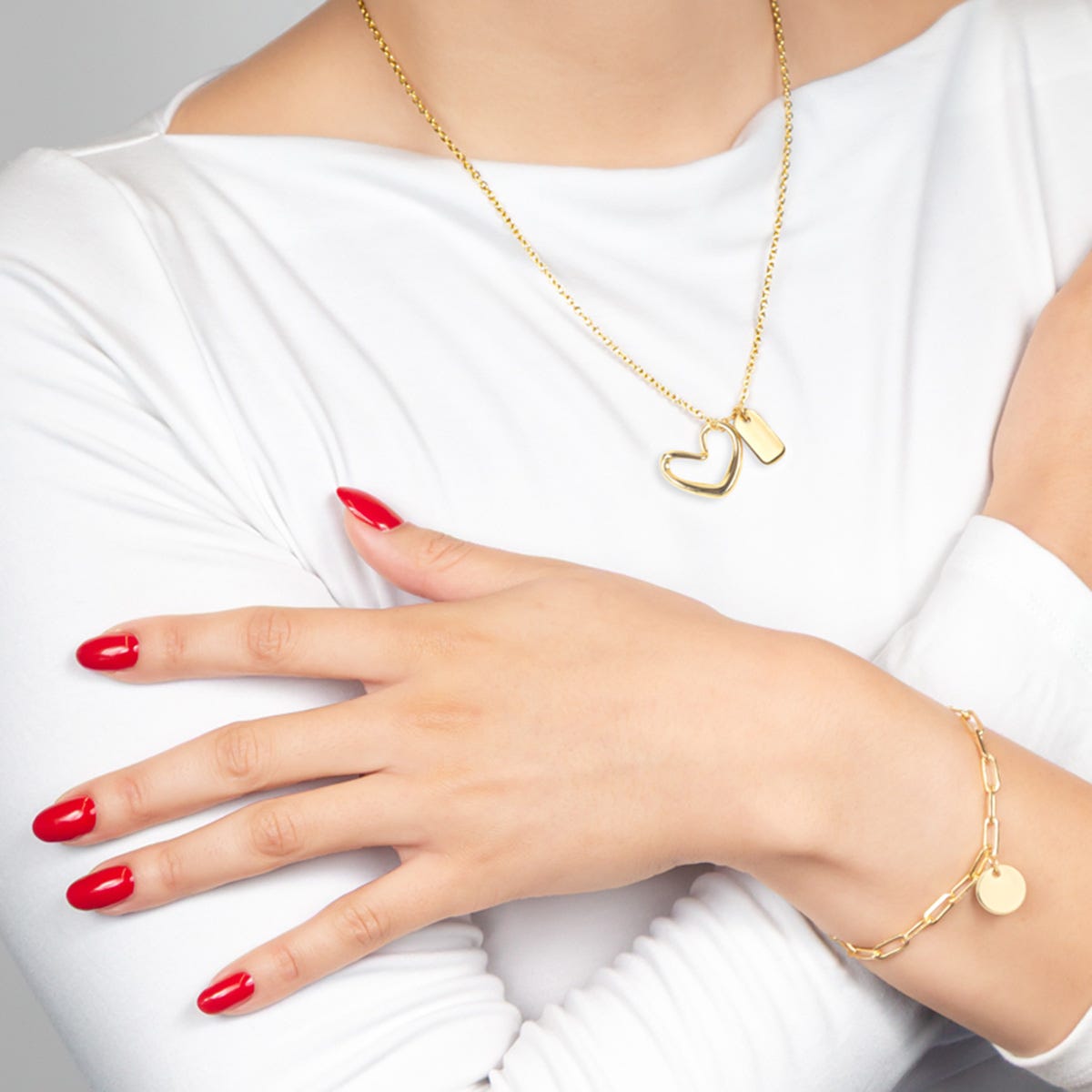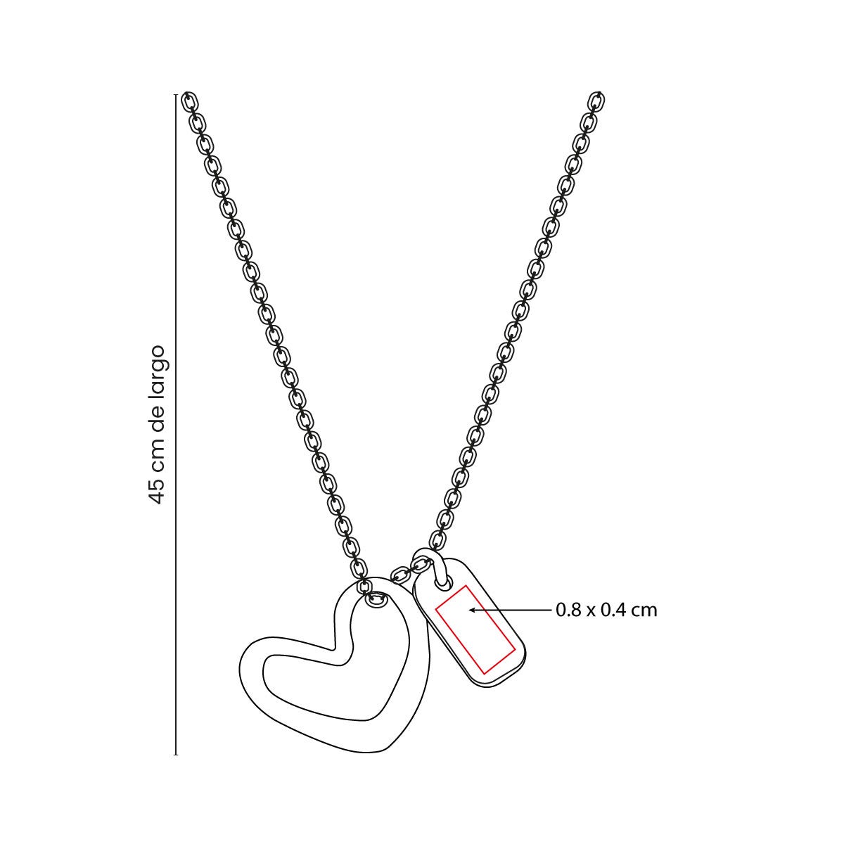 Descripción: Collar con dije en forma de corazón. Placa para grabado. Cadena base de latón de 45 cm + extensión de 3 cm, ambos con chapa de oro de 1 g. Dijes y placa de marca fabricados en metal zamac, también con chapa de oro de 1 g. Instrucciones de cuidado: Limpiar con un paño seco. Evitar contacto con el agua o productos químicos. No dormir, ni bañarse con la pieza. Incluye caja individual.