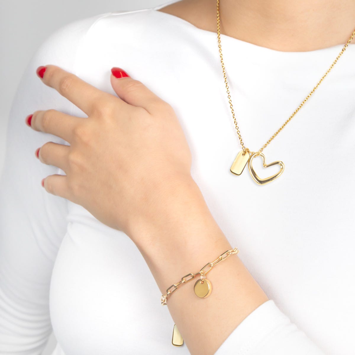 Descripción: Pulsera con dije circular. Placa para grabado. Cadena base de latón de 16 cm + extensión de 3 cm, ambos con chapa de oro de 1 g. Dijes y placa de marca fabricados en metal zamac, también con chapa de oro de 1 g. Instrucciones de cuidado: Limpiar con un paño seco. Evitar contacto con el agua o productos químicos. No dormir, ni bañarse con la pieza. Incluye caja individual.
