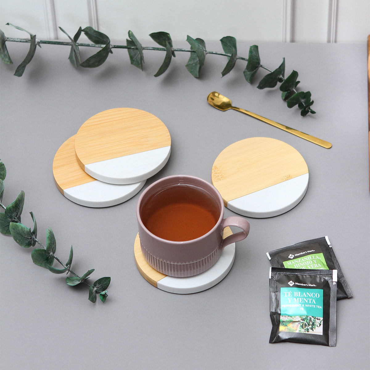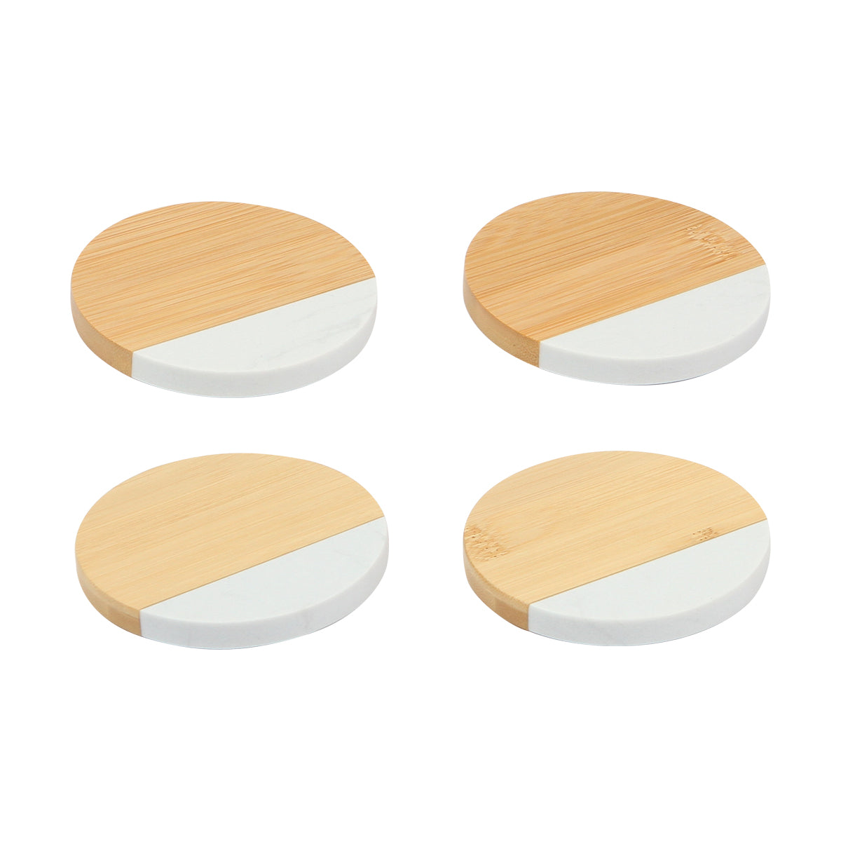 Descripción: Juego de 4 porta vasos fabricados en mármol blanco y bambú con acabado en laca. Cuentan con 3 antiderrapantes en la parte de abajo para mayor seguridad.