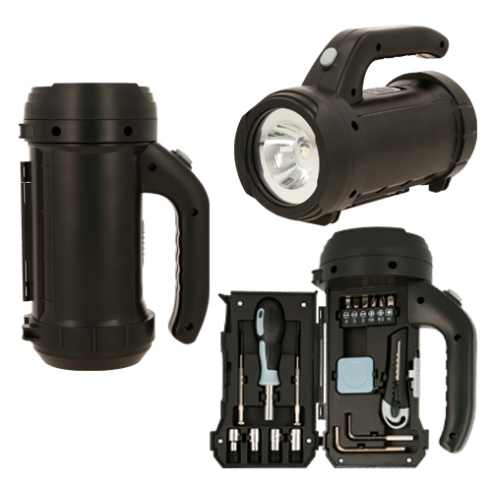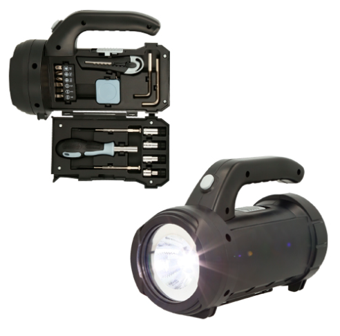 Descripción : Linterna portátil 2 en 1. Lámpara de LED y apartado de herramientas en el costado. Incluye 17 accesorios: 1 metro, 1 cutter, 2 llaves Allen, 2 destornilladores de precisión, 1 mango, 5 puntas intercambiables y 4 dados. Requiere de 3 baterías AA, no incluidas.