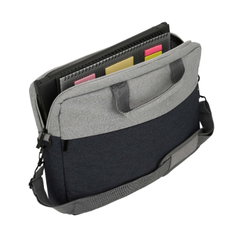 Descripción : Portafolio de poliéster con porta laptop, dos asas, banda trasera para maleta de viaje y correo ajustable.