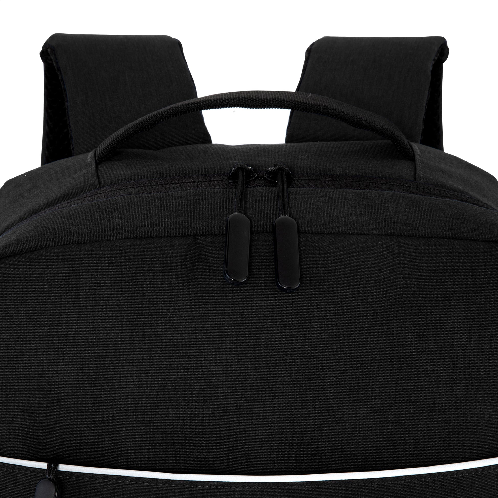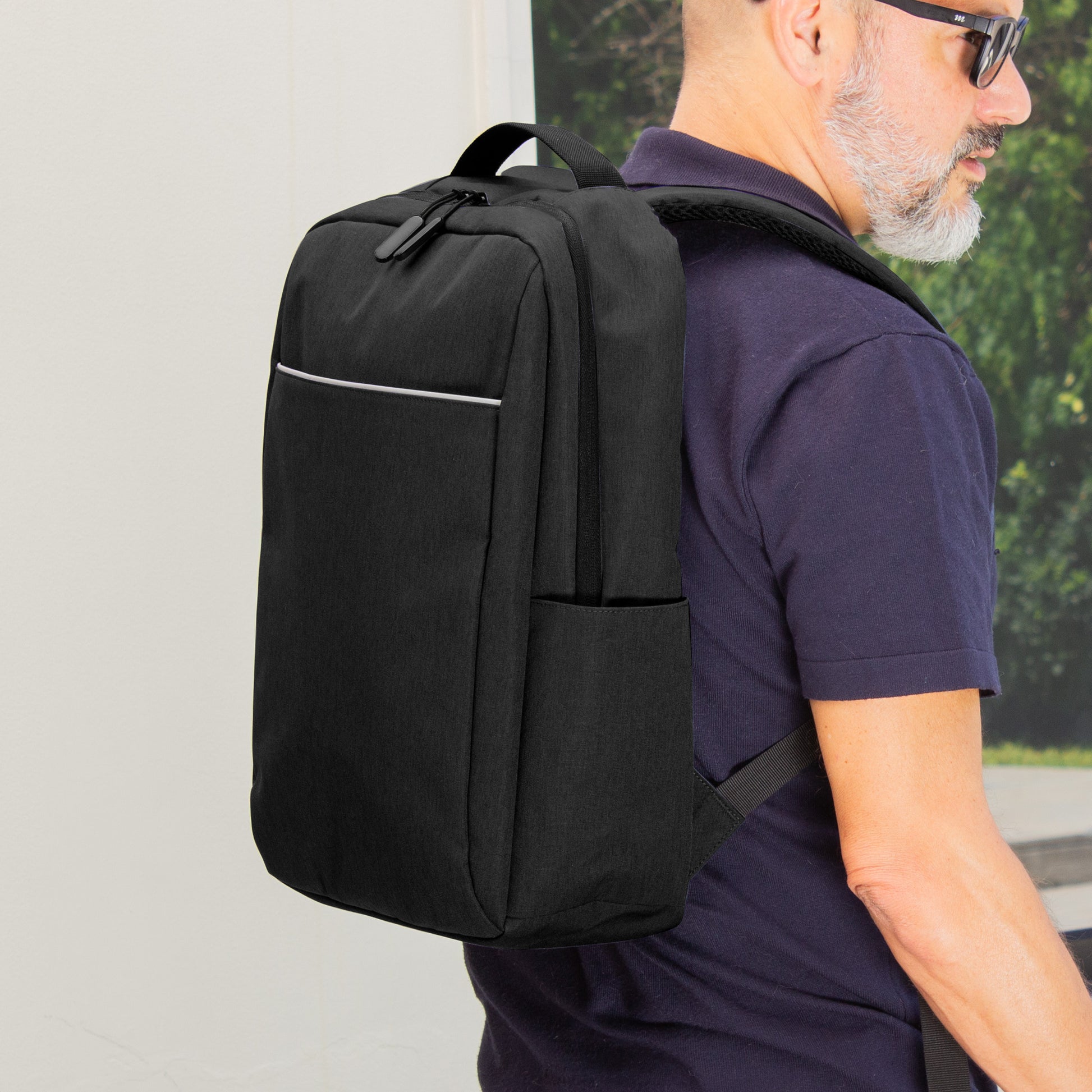 Descripción: Mochila portátil de hasta 16 pulgadas. Compartimento principal con bolsillo posterior acolchado para portátil con cierre de velcro y múltiples bolsillos para accesorios. Amplio bolsillo frontal horizontal con ribete reflectante. Dos bolsillos laterales para botellas o accesorios. Asa superior reforzada. Correas ajustables y respaldo acolchado. Tira para sujetar la mochila en la manija extensible de un equipaje de mano. Tiradores de cierre plásticos texturizados para un mejor agarre. Tejido ligero y resistente, de secado rápido