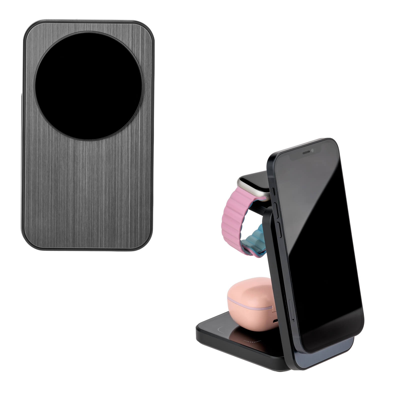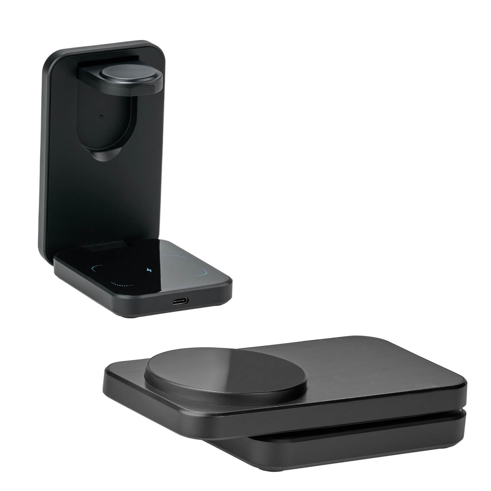 Descripción: Multicargador inalámbrico plegable 3 en 1 para smartphone, audífonos y reloj inteligente. Cuenta con cable de carga Tipo C.