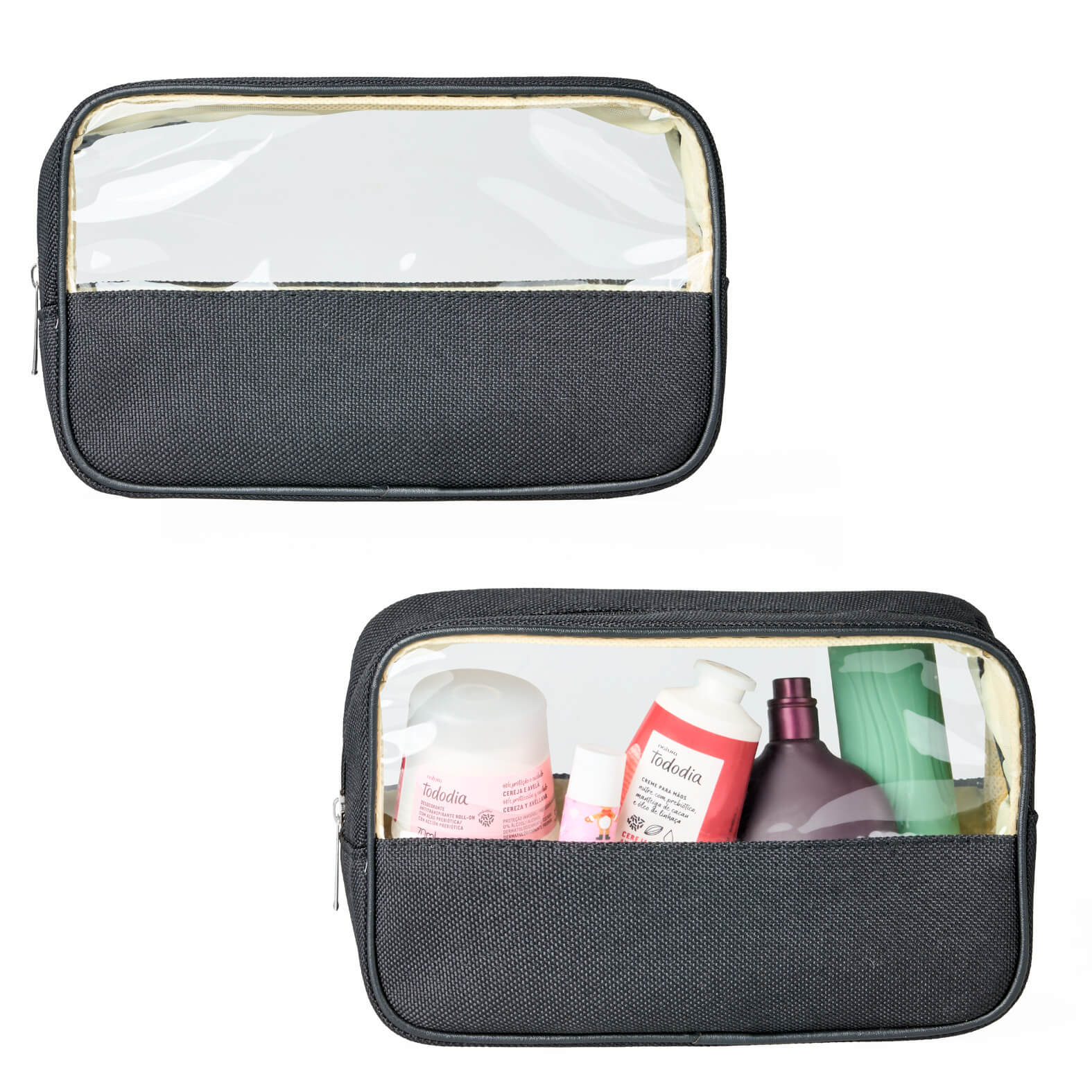 Descripción: Neceser de plástico con parte superior transparente, interior forrado y cierre.